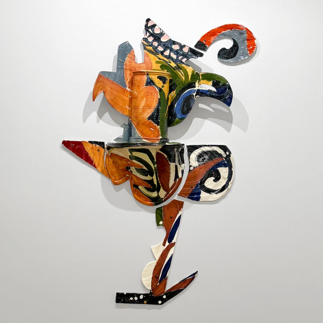 L to R: Betty Woodman. "Balustrade Relief Vase: 30," 1991, 55 x 38 x 8 1/2 in. Glazed earthenware, epoxy resin, lacquer, paint © Woodman Family Foundation / Artists Rights Society (ARS), New York | Installation view, "Drop, Cloth," Hollis Taggart Gallery, New York, 2025. Image courtesy Hollis Taggart Gallery | "Drop, Cloth." New York: Hollis Taggart, 2025
