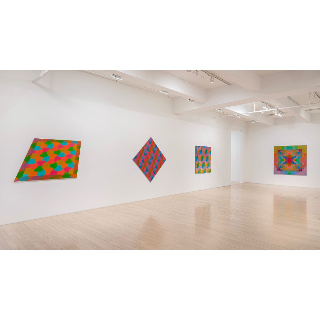 L to R: 1: “Untitled,” 1978, 49 x 49 in. Acrylic on canvas | 2: Installation view, “George Woodman: A Democracy of Parts, Paintings 1966-1978,” DC Moore Gallery, New York, New York, 2025 | 3: “Grey Portal,” 1978, 84 x 84 in. Acrylic on canvas | 4: “Untitled,” 1978, 48 x 48 in. Acrylic on canvas | 5-7: Installation views, “Three Paper Tilings,” Claremore College, Claremore, Oklahoma, 1979 | 8: Installation view, “Paper Tilings,” Denver Art Museum, Denver, Colorado, 1980 | 9: “Sentimental Geometry,” 1981, 120 x 252 in. Paper tiles. Installation view, “Criss-Cross at Yellowstone,” Yellowstone Art Center, Billings, Montana, 1981 | 10-11: “Rochester Carpet,” 1984. Hand-painted chipboard tile installation. Bevier Gallery, Rochester Institute of Technology, Rochester, New York, 1984. All artworks by George Woodman © Woodman Family Foundation / Artists Rights Society (ARS), New York. Woodman Family Foundation Archives.