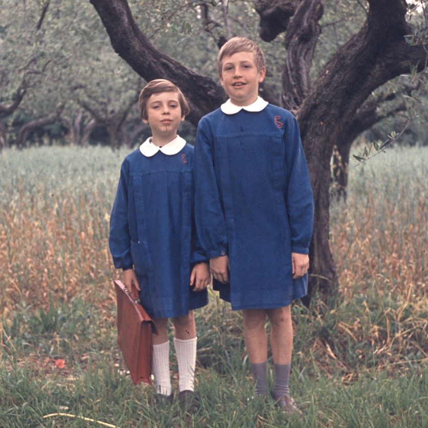 Francesca and Charlie in their grembiule (Italian school uniforms), c. 1965-66. Woodman Family Foundation Archives.