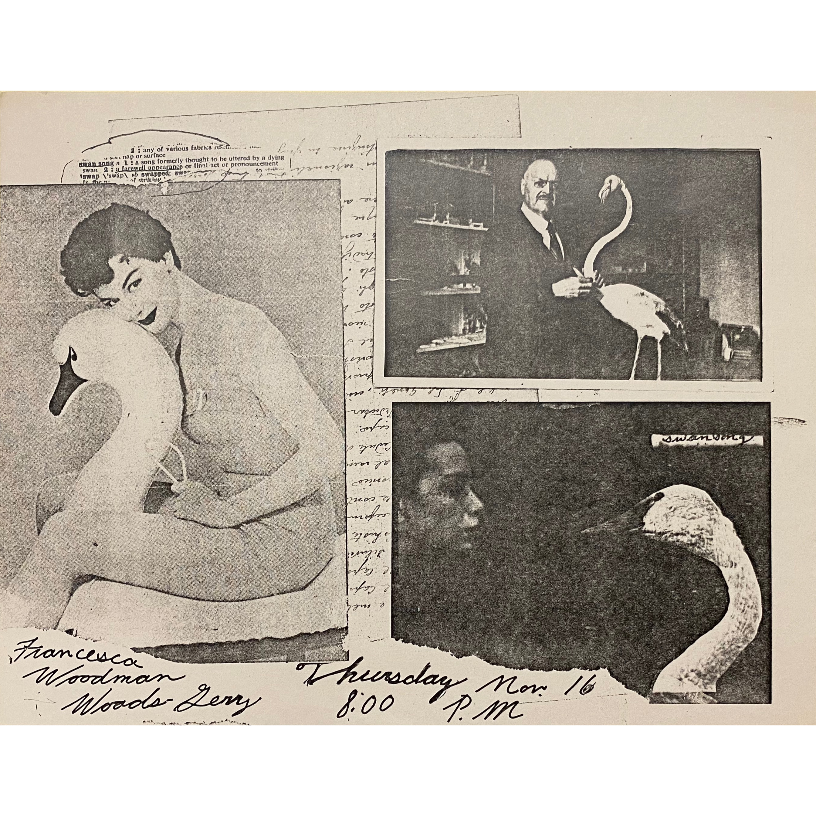 Francesca Woodman’s graduate exhibition as a student at the Rhode Island School of Design was held at the school’s Woods-Gerry Gallery in November 1978. She considered it a “swan song” to her time there as shown in her photocopied invitation. She reported on the opening in a letter to her friend Edith Schloss: “you would have enjoyed it i bought all these bird whistles that one fills with water and they warble in n.y. do you remember them from when you used to live there? anyway the room was very echoey with these things and i actually enjoyed the opening.”