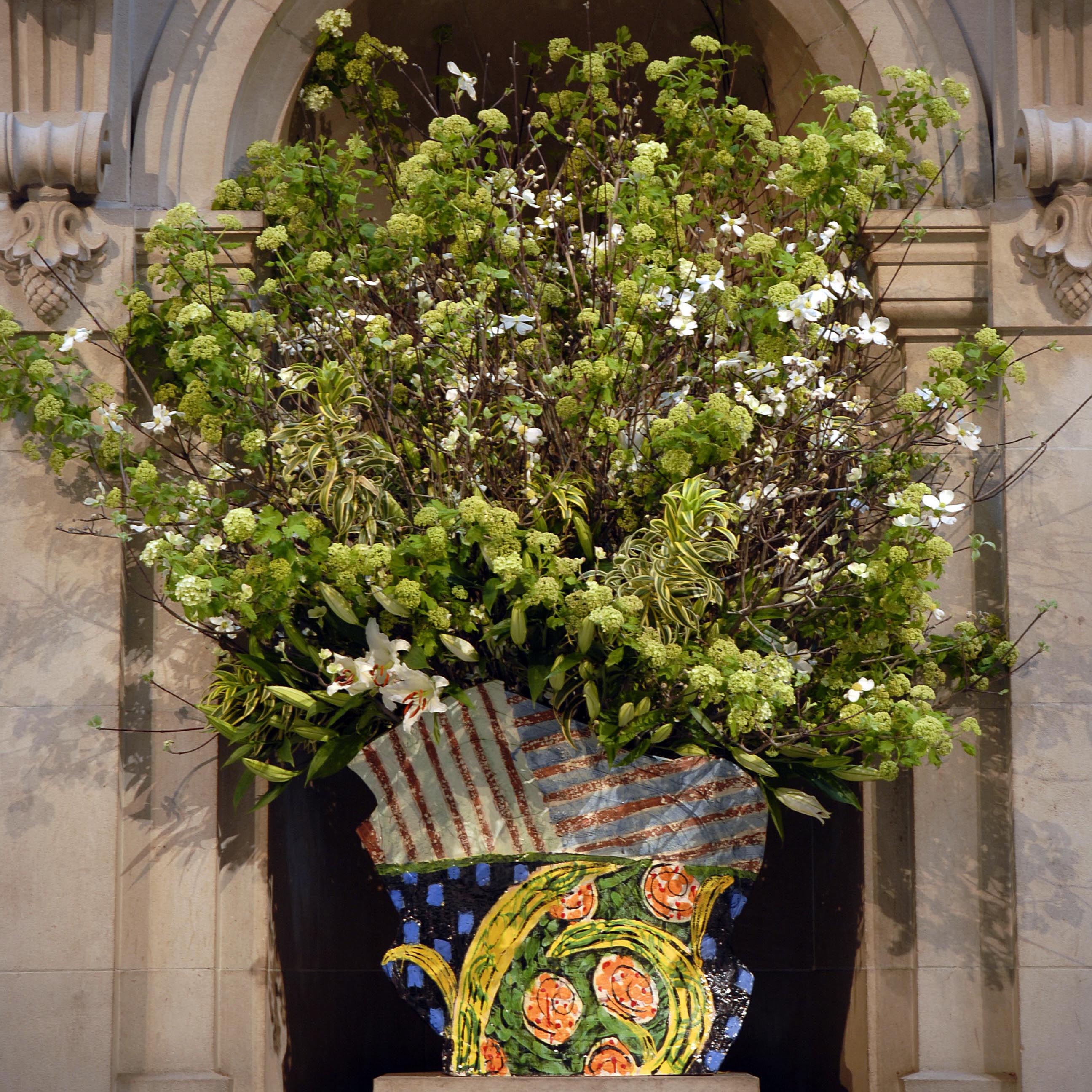 Spring flowers always remind us of Betty Woodman, and particularly her vases in the Great Hall of the Metropolitan Museum of Art, which greeted visitors to the museum with their bold colors, overlapping patterns and allusions to vases and gardens, holding an ever-changing display of seasonal blooms. They were installed on the occasion of her 2006 retrospective there—the first time the museum dedicated such an exhibition to a living woman artist.