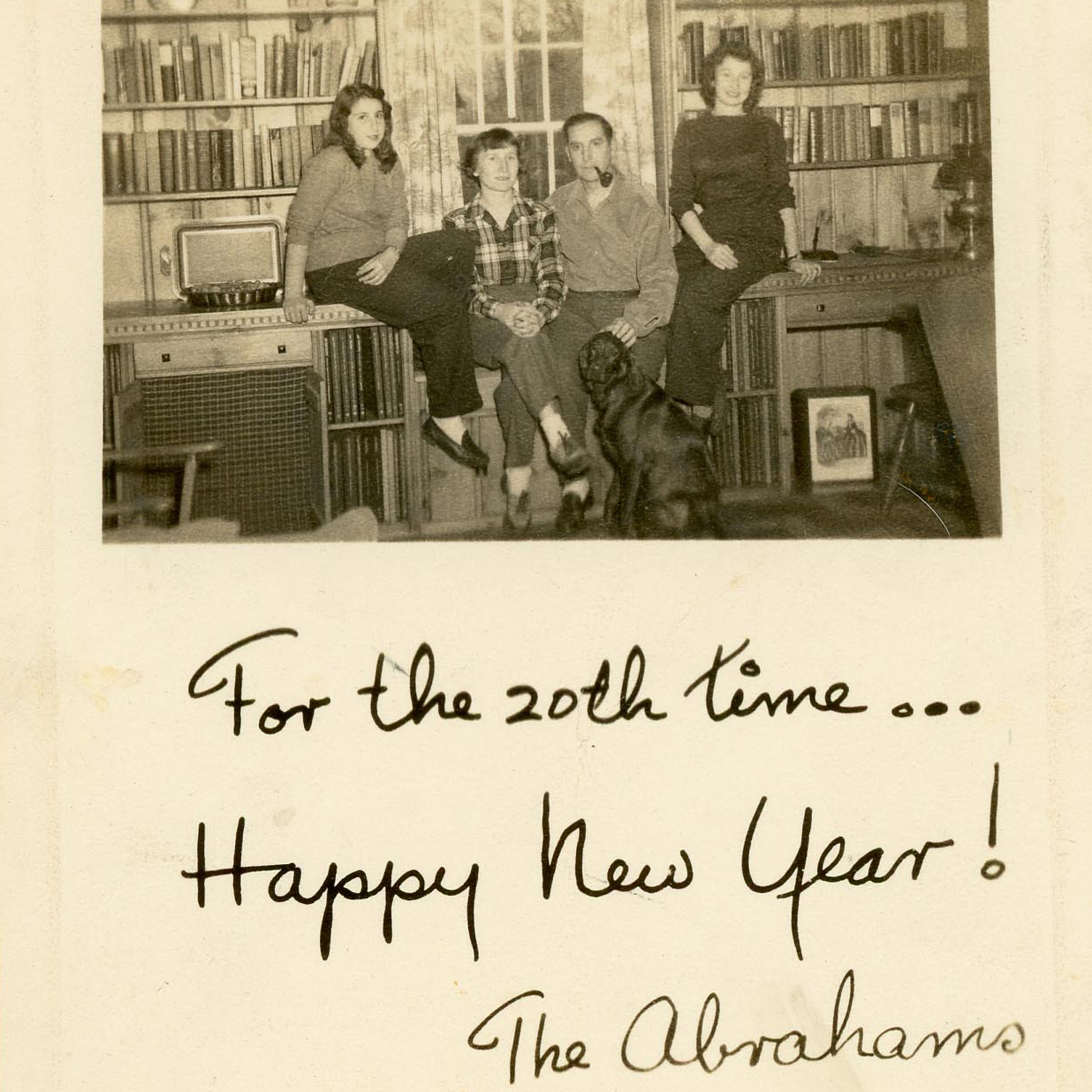 The Abrahams Family New Year card, circa 1946-1950. From left to right: Betty, Minnie, Henry and Dot Abrahams.