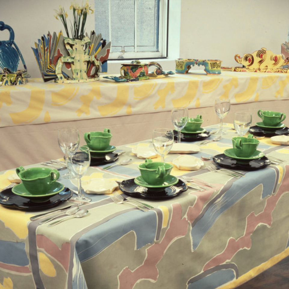 “Presenting Food,” 1985, marked Betty Woodman’s second project with the Fabric Workshop and Museum and a farewell to her work as a functional potter. For this dinner-performance event, held at the museum’s New York City gallery space, Woodman responded to chef Daniel Mattroce’s menu with her signature ceramic dinnerware and serving dishes, accompanied by fabrics she designed and printed at FWM’s Philadelphia studios. Woodman later recounted: “These are my last functional pieces, ‘presented’ like the food in an almost operatic finale.”