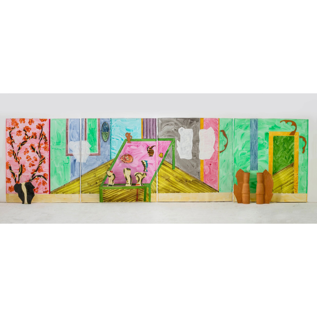 Betty Woodman. “Courtyard: Pontormo,” 2016. 110 x 84 x 10 in. Glazed earthenware, epoxy resin, lacquer, acrylic paint, and canvas.