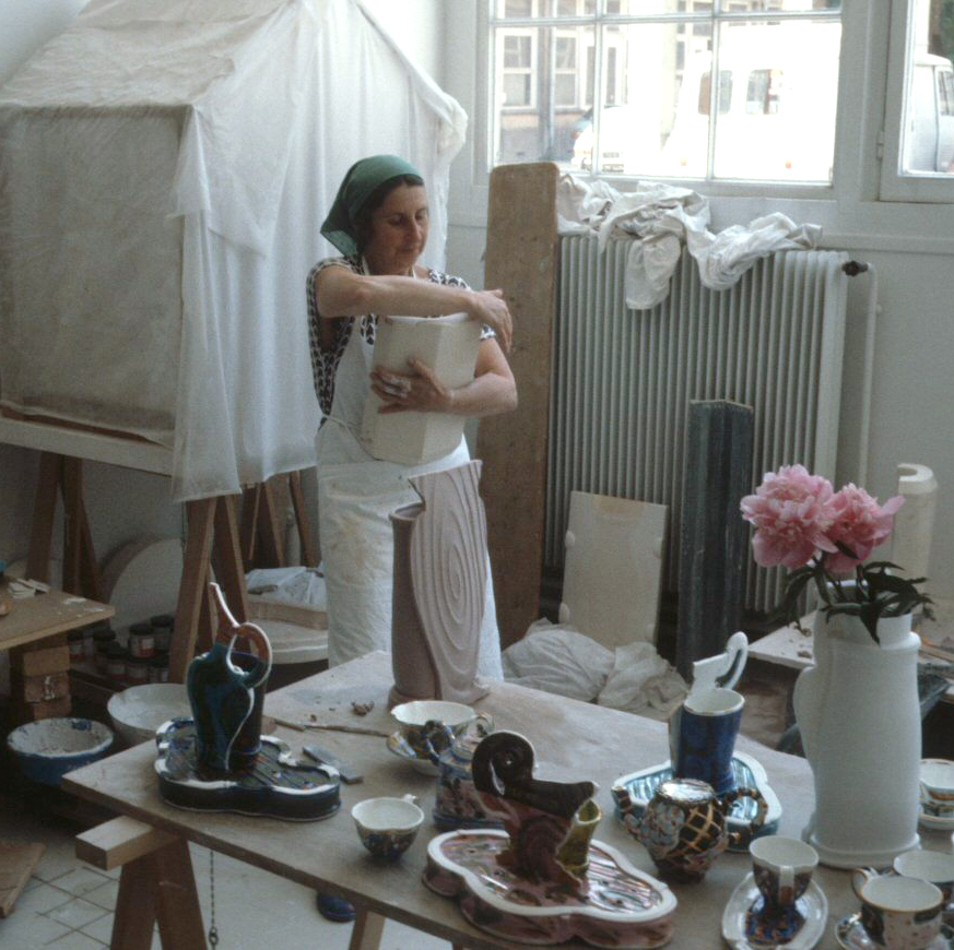 Betty Woodman working at the Manufacture nationale de Sèvres, France, c. 1987. Woodman Family Foundation Archives.