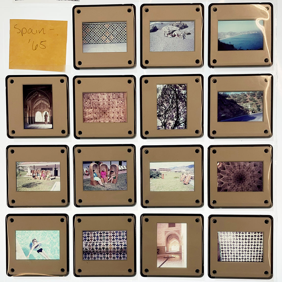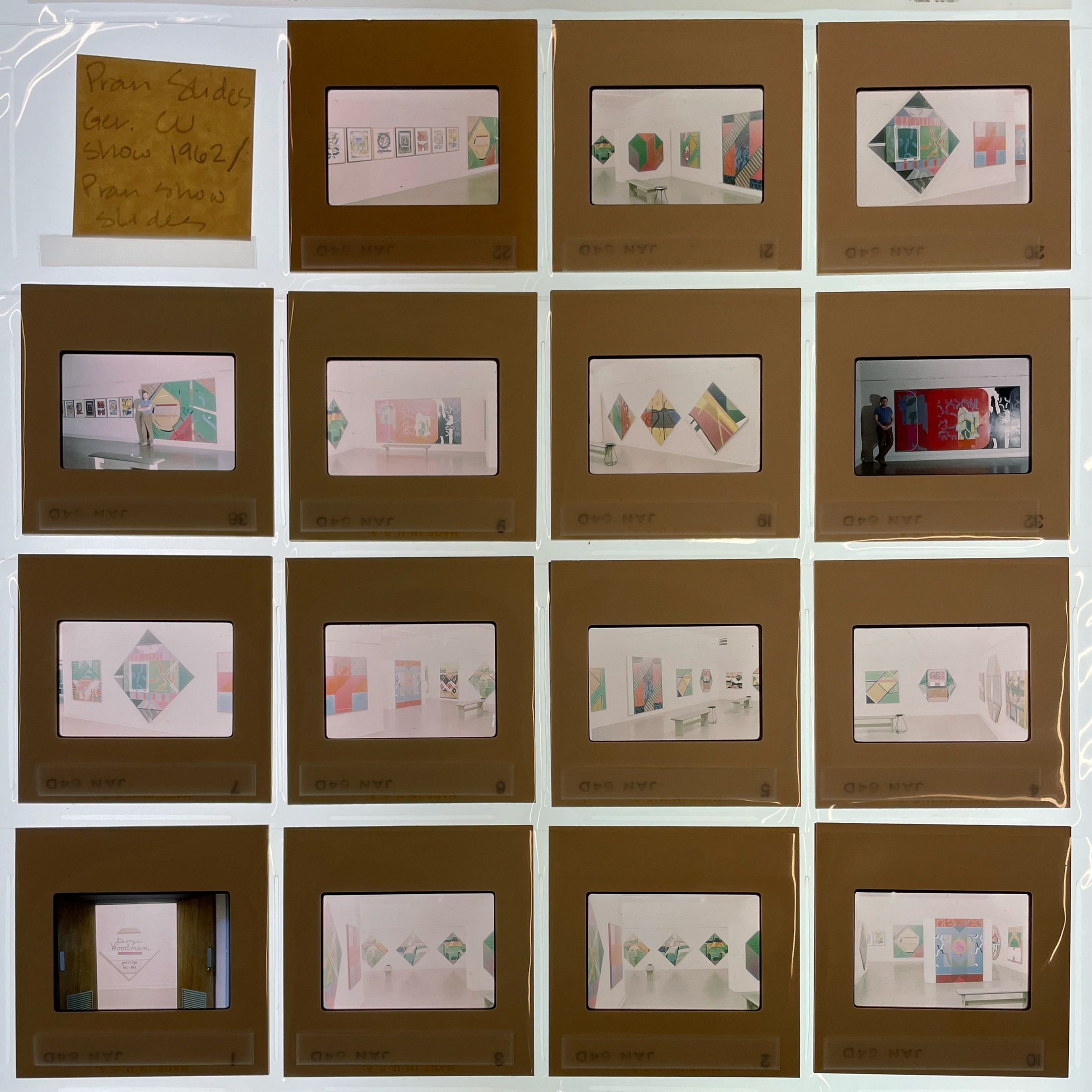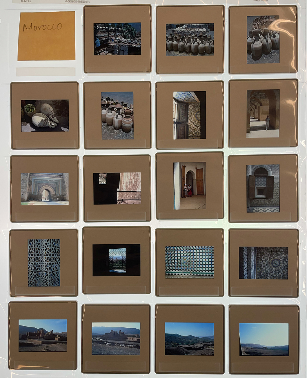 L to R: George Woodman, c. 1963 from slide preserver with slides most likely from his solo exhibition at Henderson Gallery, University of Colorado, Boulder, 1963. The installation views of such an early show in George's career are so exciting to see, especially since there are far fewer photos of these earlier shows / Photo of George’s New York studio with “Lattice Lady with Convolvulus,” 1986 visible in the background. I love getting glimpses of the artist's studios and how the set up of them reflects the artist himself / George's Palazzo Pitti show in 1987 where he can be seen taking the photo in a mirror. I don't actually get to see images of George, so I liked that he set up this shot so that you could see him actually taking the photo / Overview of a small portion of slide cases in George's collection. Not the prettiest picture, but it's interesting to see the number of slide cases in the collection and George's handwriting on each of them / Slide preserver with slides from a trip to Spain in 1965 featuring photos of tiles, nature, and people. I like how even on a trip, George is still thinking about his art and taking photos of things that can inspire his own work / Slide of George Woodman. “Untitled #VIII,” c. 1980s. Monotype. 30 x 22 in. I thought it was interesting to see the process and sketch of an artwork and how it is different from the final product / Slide preserver “Pictures of house 1965” featuring the interior and exterior of the family’s house in Boulder, Colorado. It's a view into the personal life and residence of George, and one of the few times in the slides where it seems that none of the photos are related to any artworks or research / Slide of George Woodman. “Untitled,” 1966. A medium format slide of one of George's earlier paintings that I really enjoyed / Slide preserver with slides from a trip to Morocco featuring photos of tiles, pottery, and the landscape. George is still thinking about his art and took photos of things that would inspire his own work. All materials George Woodman Collection, Woodman Family Foundation Archives, New York.