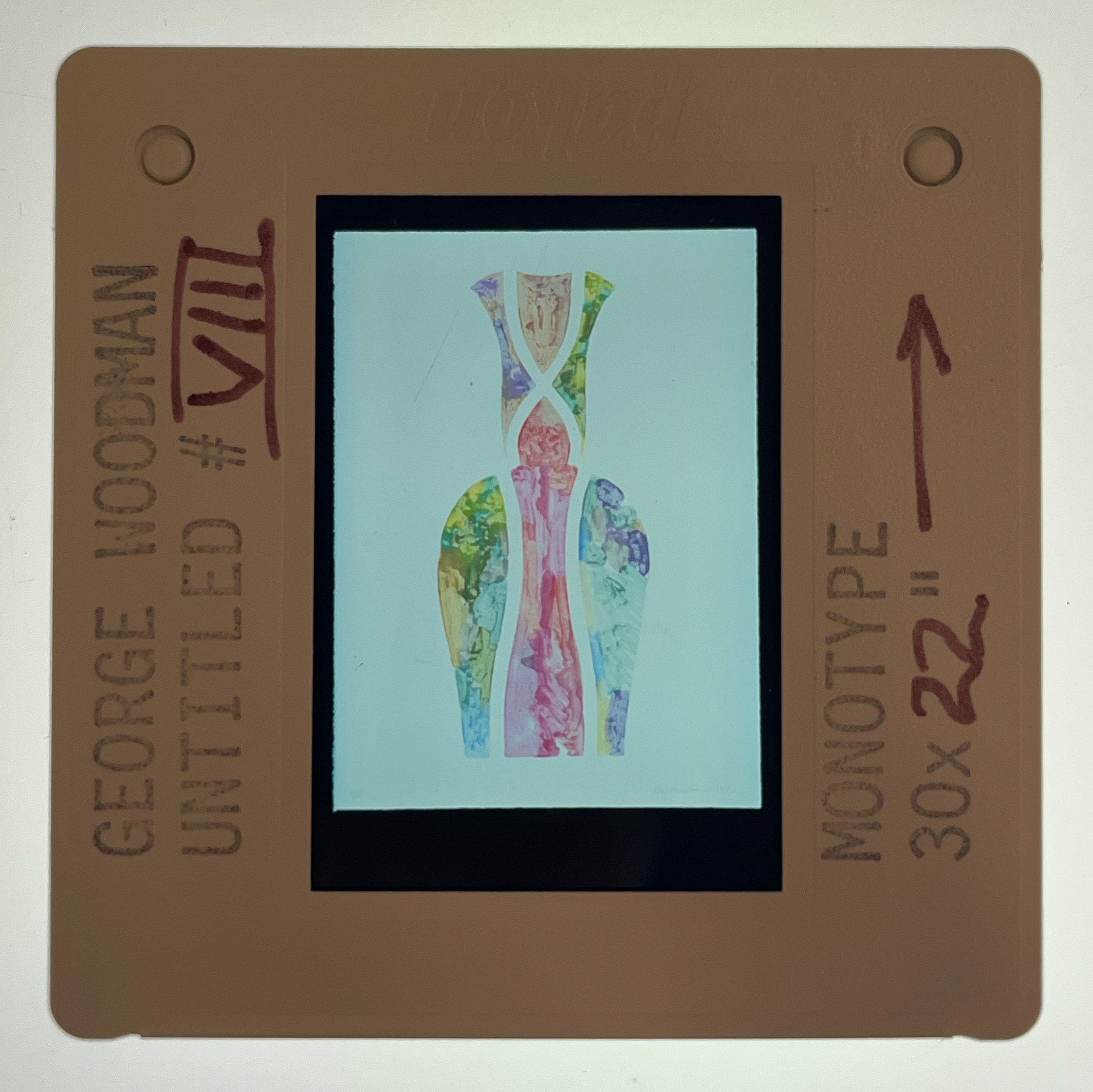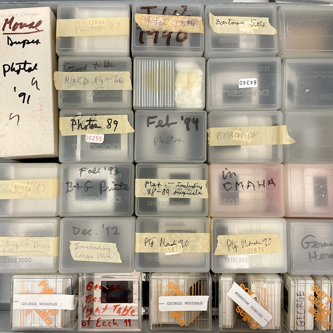 Our archival intern Erin Moss, who is in her second year at the Pratt School of Informationearning her MLIS, has been processing George Woodman's extensive slide collection this semester. The slide collection consists of thousands of 35mm or medium format slides from the 1950s through the early 2000s documenting both George's work and personal life. Erin has been struck by the experience of discovering an artist through their own archival materials.