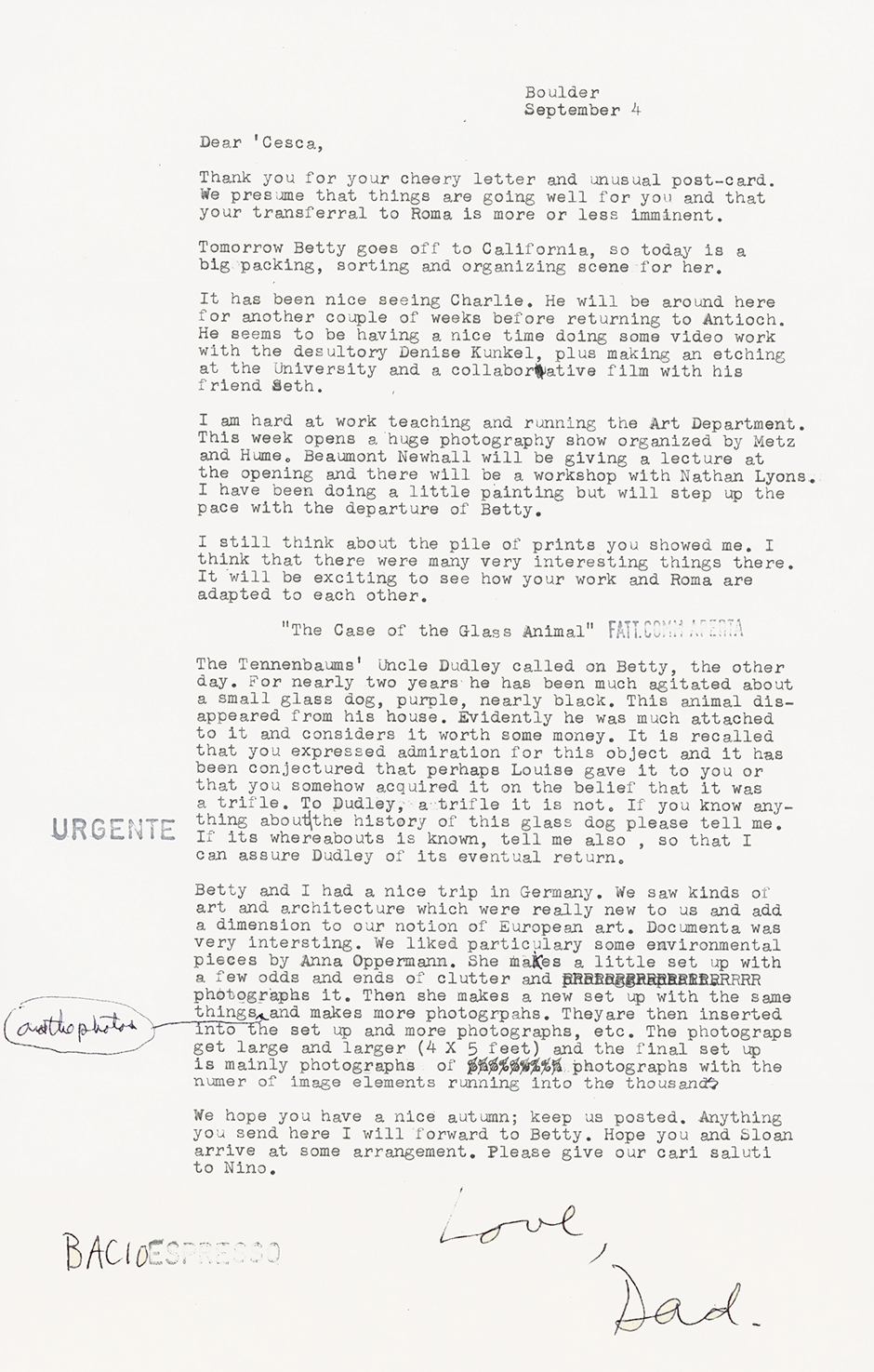 September of 1977 marked the start of new academic year for each of the Woodmans and the pursuit of teaching or studies in four different locations around the US and Europe. Francesca had just begun her fruitful year in Rome with the RISD European Honors Program, after spending some time in Antella. In a letter sent to her from Boulder, George recaps summer travels and reports on the rest of the family’s activities: Betty was about to head to Scripps College in Claremont, California where she would spend the semester as a visiting artist; Charlie would soon be returning to Antioch College in Yellow Springs, Ohio where he would continue his work with film and video; and George was holding down the fort in Boulder, busy with teaching at the university, running the art department, preparing for visiting artists and critics, and, of course, painting.