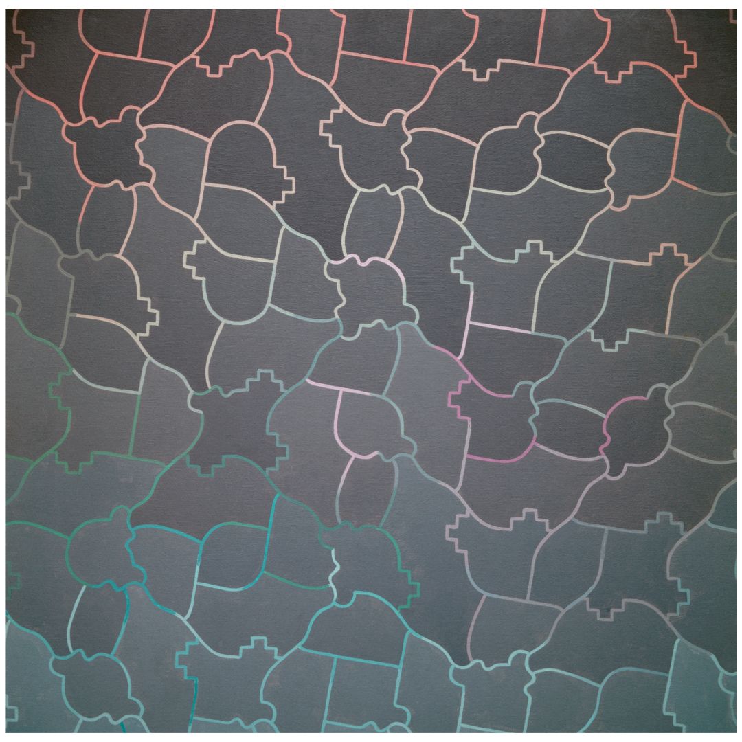 By 1977, George Woodman’s tessellation paintings became non-periodic or aperiodic, consisting of a set of shapes which tiled the canvas but did not necessarily repeat. In her catalogue essay, Rebecca Lowery elaborates on one example: “Woodman’s tessellating forms in Grey Portal are intriguingly eccentric, their mix of straight and irregularly undulating facets resembling something like a map. The complexity of the arrangement is astounding: more than 50 different tile shapes make up its mysteriously undulating surface, some of which are only seen once or twice.