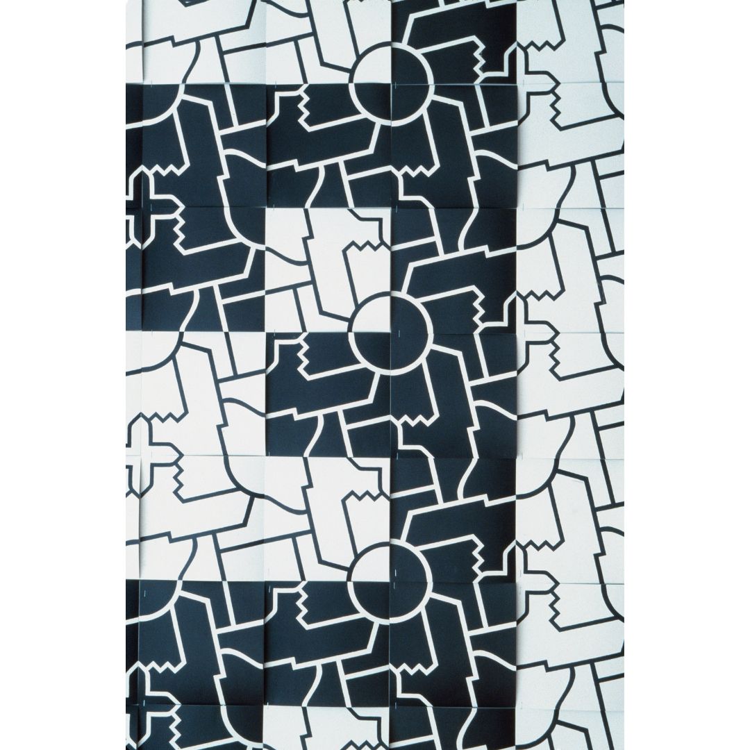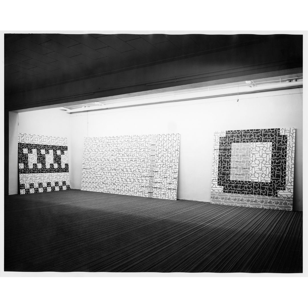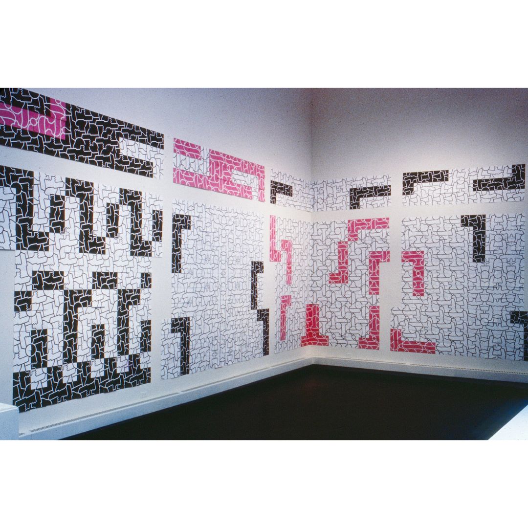 ”In order to develop patterns from non-identical shapes and non-identical arrangements of repeating shapes, Woodman first made templates. He hand-drew groups of individual elements and re-combined them in a variety of ways before translating them onto a canvas. In the fall of 1978, to further experiment with this approach, he had 400 tiles of four different drawn elements and their mirror images printed onto paper in black, white and magenta. Rather than restricting his work within the two-dimensional confines of a painting, these paper tiles allowed him to move pattern into three-dimensional space through a series of site-responsive installations. “I was much taken with the idea of showing work created for and in the actual exhibition space from easily transported and inexpensive materials,” he wrote. He eventually made more than a dozen such installations in museums and galleries across the country.