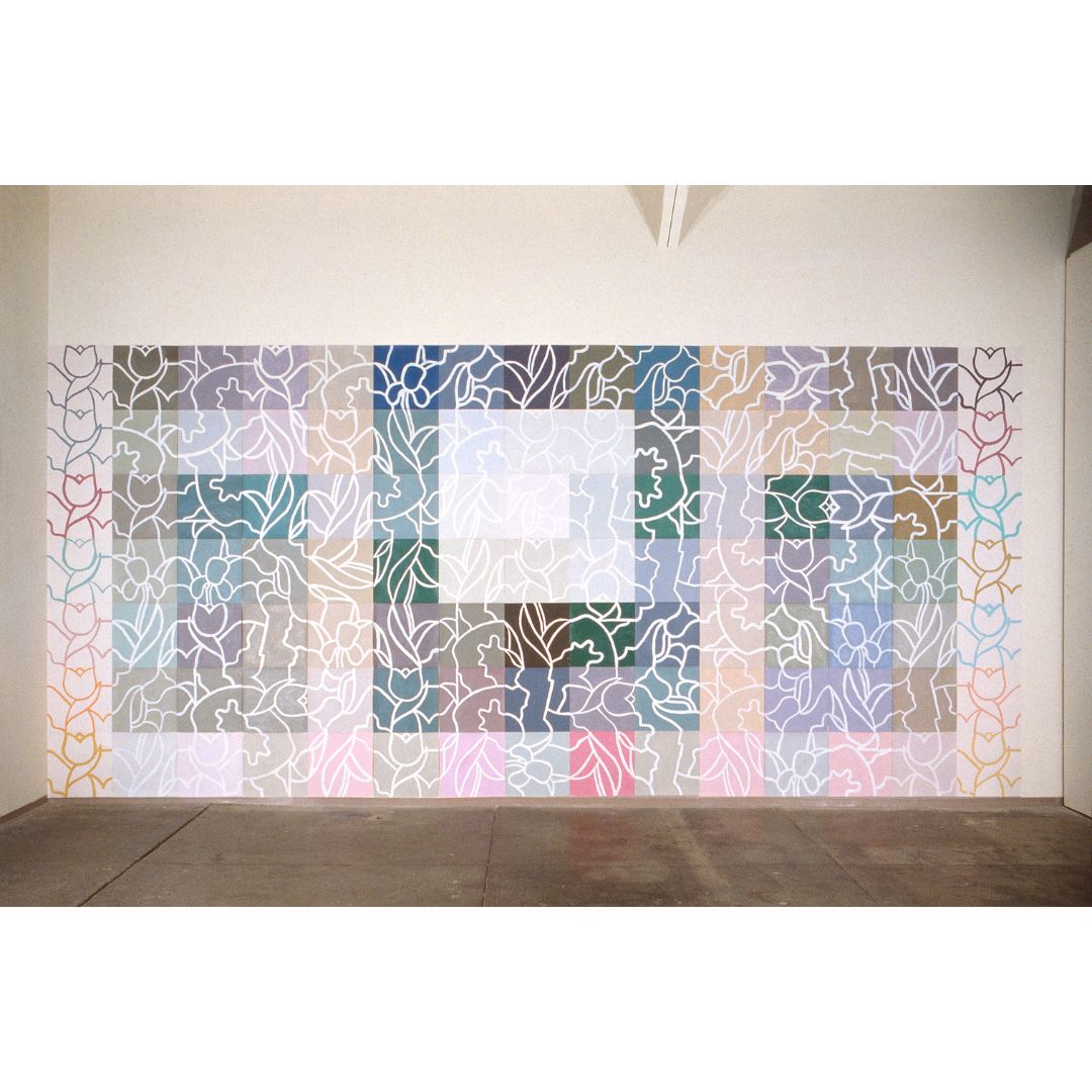 The first of Woodman’s paper tile installations in 1979 was made from the very same tiles he had first produced for study, attached to free-standing panels at Claremore College in Oklahoma. In subsequent installations, the paper tiles were stapled directly onto the wall, at times forming immersive environments. Woodman’s tiles also shifted from pre-printed to hand-made, often realized in collaboration with students and based on Woodman’s instructions for integrating a color system. In the very last of these installations in 1984, Woodman worked with students to construct a sprawling tiling for the floor of the Bevier Gallery at Rochester Institute of Technology in Rochester, NY.