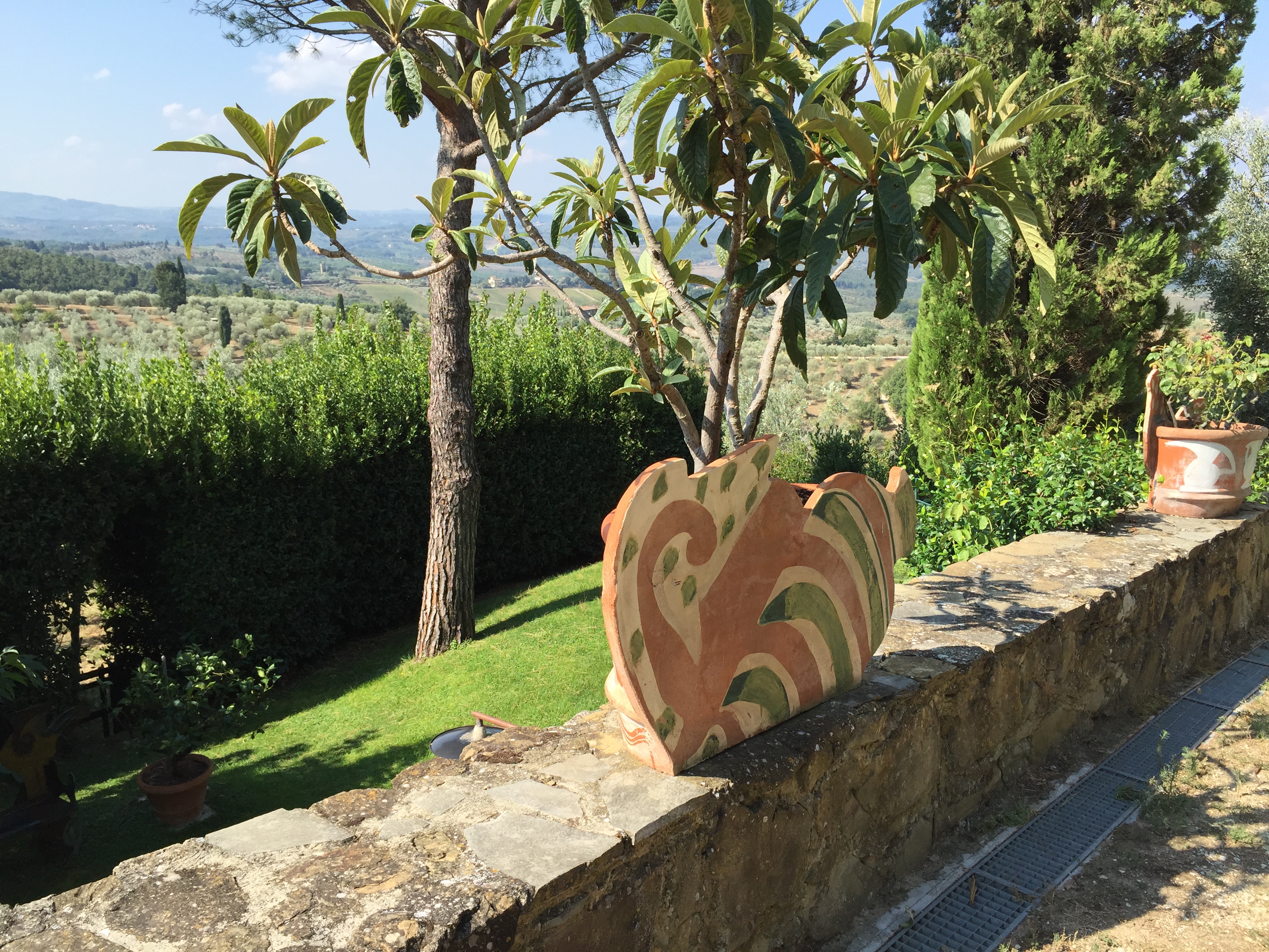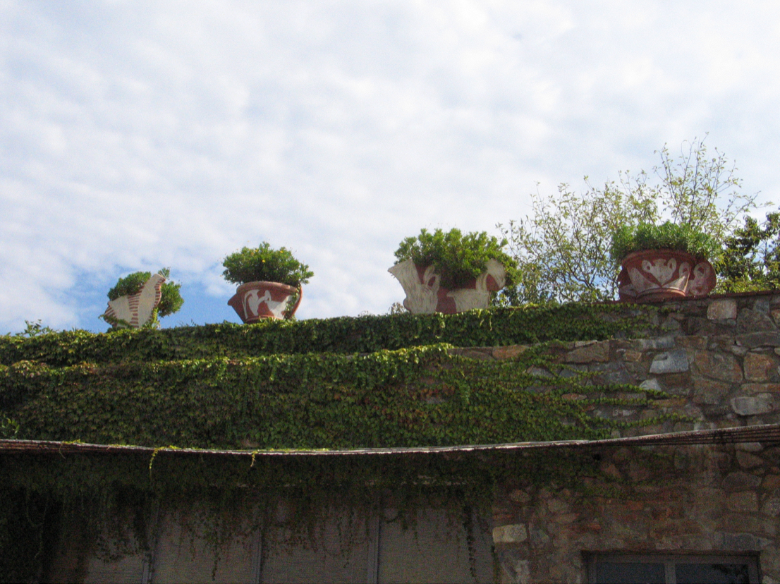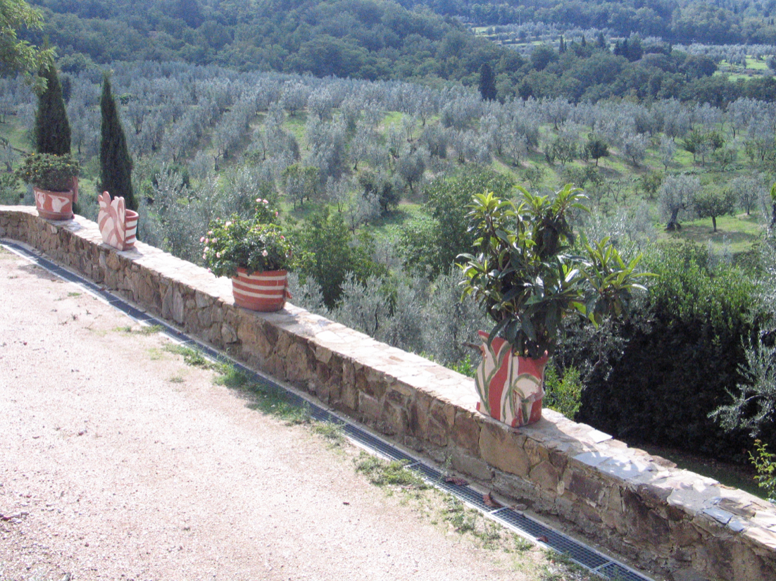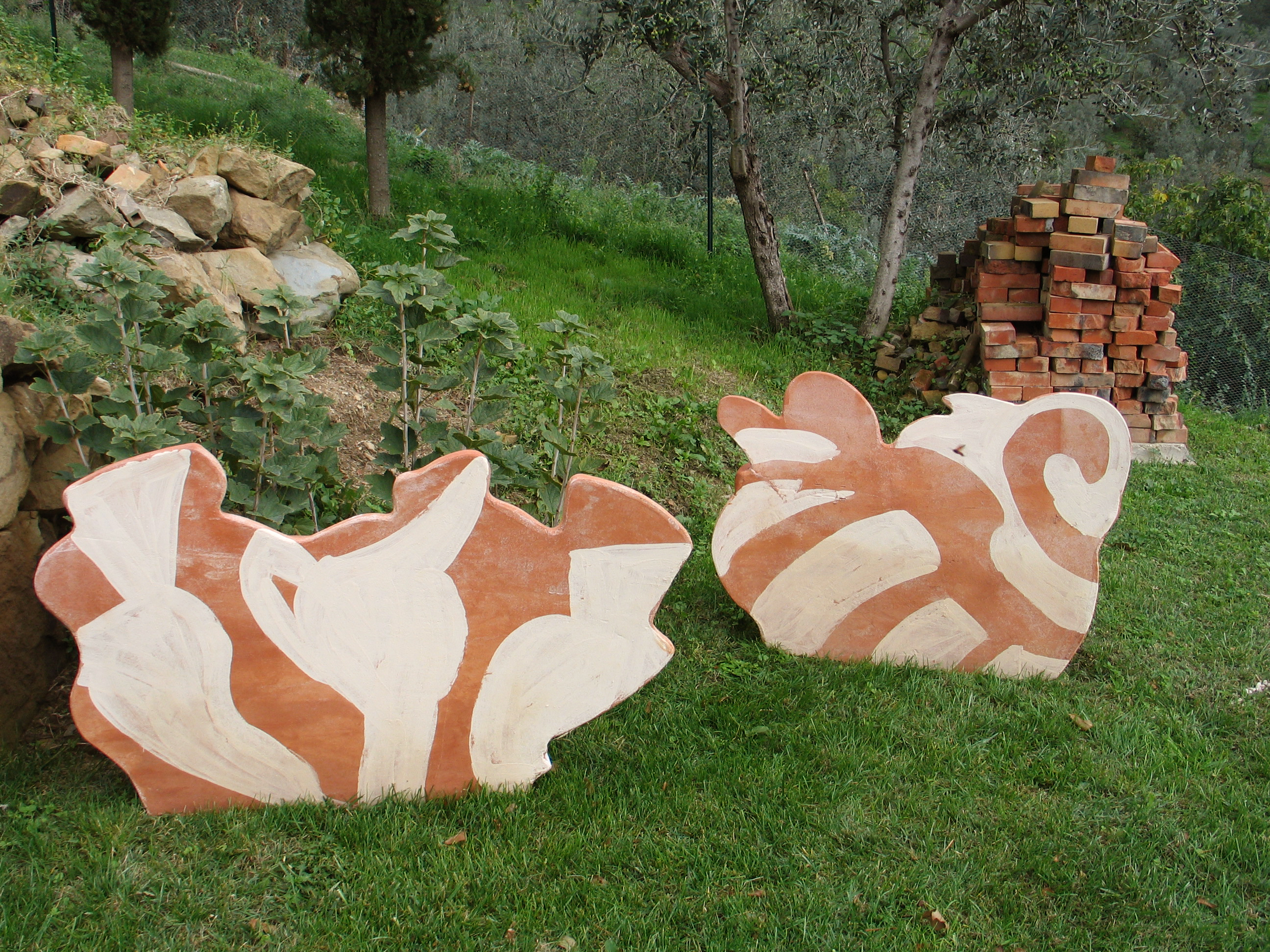 Over summers spent in Antella, Italy, Betty Woodman often developed projects which could only be realized there. From 1998-2004, she collaborated with a pottery in Impruneta—a nearby town renowned for its terra cotta clay—enlivening their standard-issue garden planters with her vase-shaped façades and signature brushstrokes. These works, which fused her functional and sculptural concerns, then populated the Tuscan landscape around the home she shared there with George.