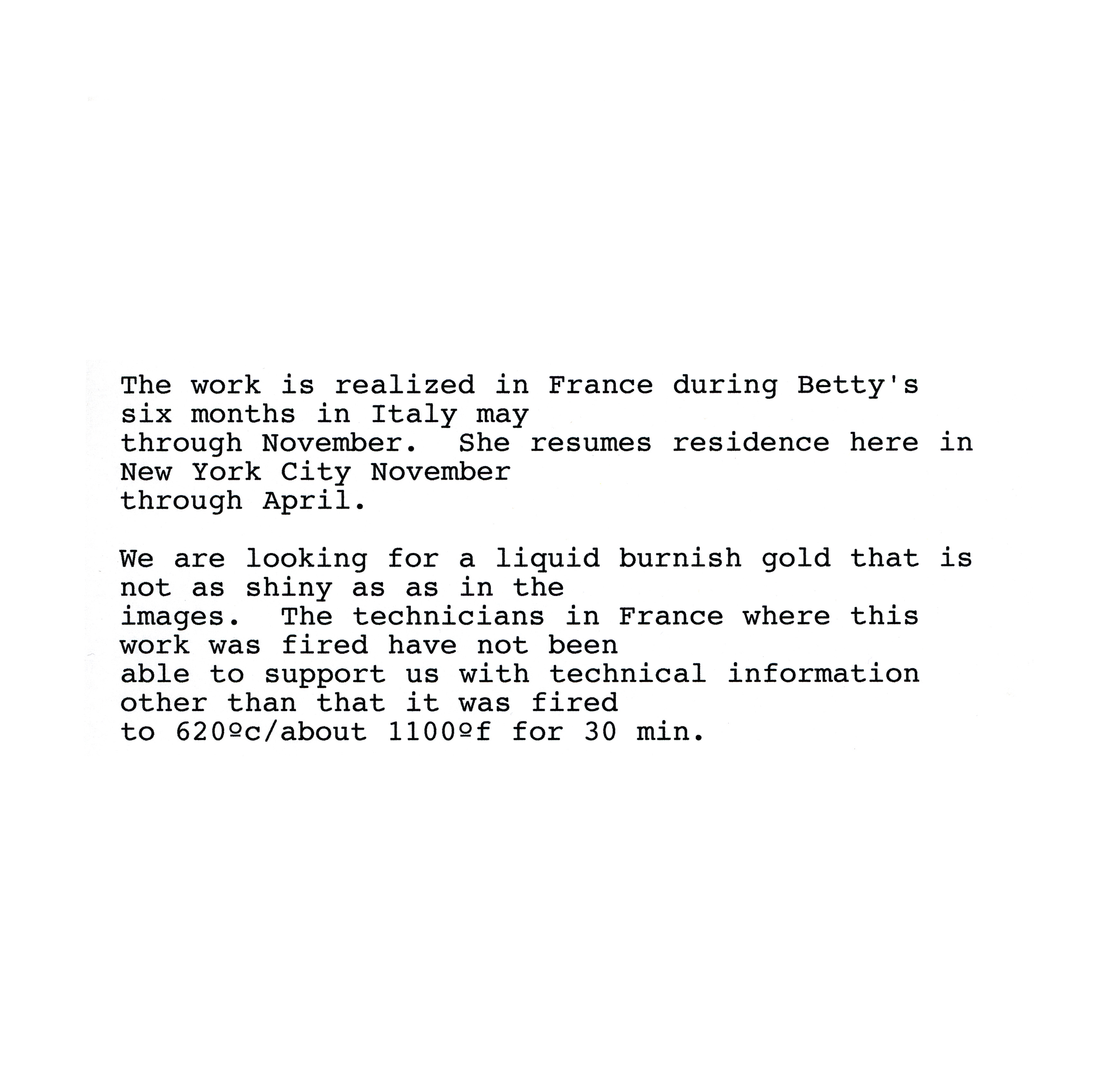 Explore the Foundation’s archives to trace Betty Woodman’s process—through her notes, samples, and correspondence—as she sought the materials that helped bring her golden visions to life.