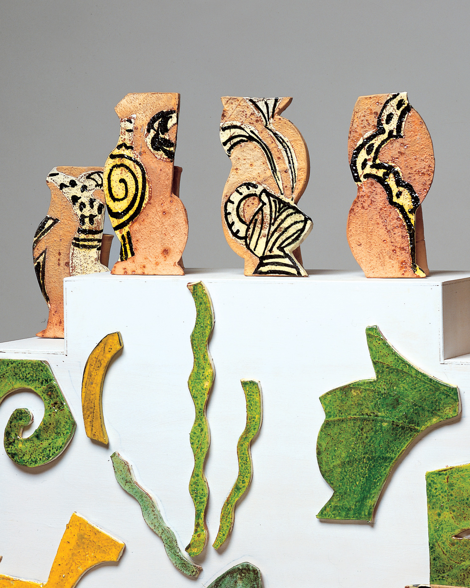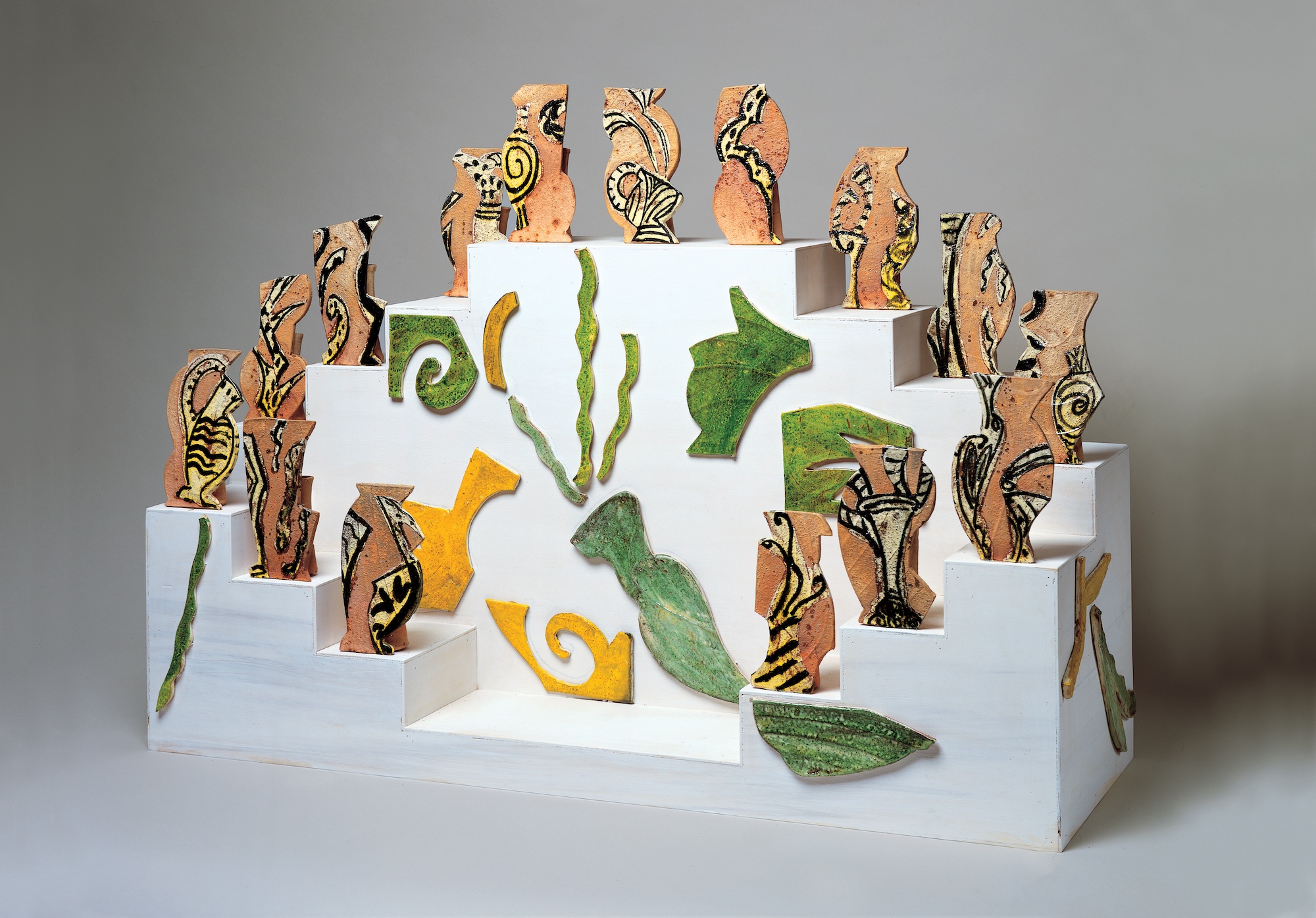 This sensibility permeated her oeuvre, where vessels often assumed the role of figures within implied rooms and stages. In Theater 2—The Rockettes (2001), she transformed pots into performers, “taking full advantage of the pot’s anthropomorphic qualities” and creating “spontaneous theatre” by arranging groups of them on pedestals and platforms. Writer Cathryn Drake wrote in the 2007 issue of Ceramic Review: “The performers in [The Rockettes]—inspired by the Radio City Music Hall dance troupe—have […] nude facades decorated with urn fragments in cream with black outlines [and] are arranged in an angled semicircle with their bellies pointing this way and that. The middle of the stage is decorated by dynamic flat ceramic swirls and diagonal urn shapes that heighten a sense of movement. Even though no body parts are represented literally, you can see why they are generally used as ceramic terms: lip, belly, neck, and foot.” As Drake declared, Woodman’s “evocative simplicity illustrates the suggestive potency of the ceramic medium,” capable of conjuring rhythm, choreography, and theatricality.