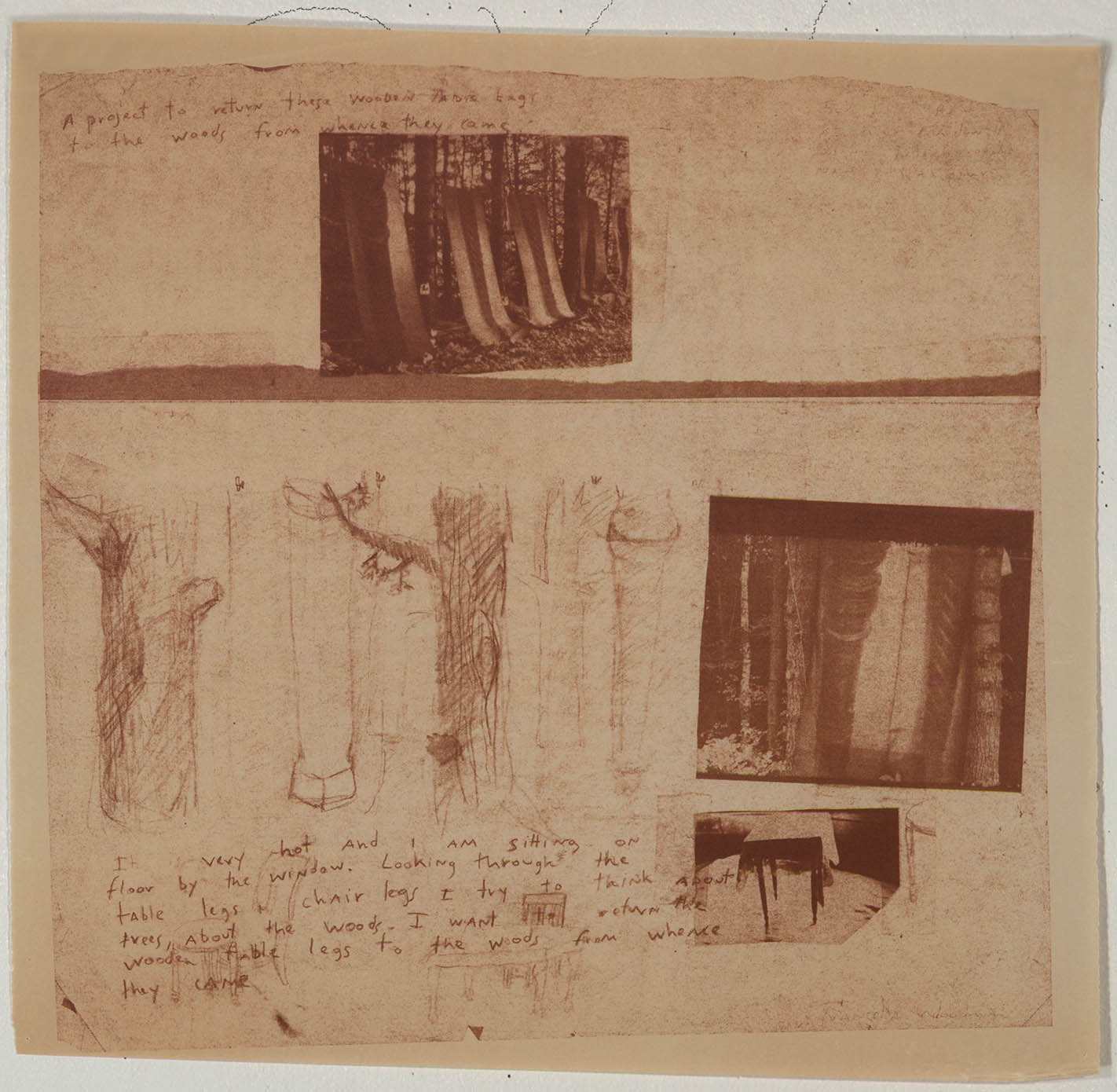 She wrote: “I am very hot and I am sitting on [the] floor by the window. Looking through the table legs + chair legs I try to think about trees, about the woods. I want to return the wooden table legs to the woods from whence they came.” And she did just that during her residency, making an ephemeral outdoor installation by hanging large-scale diazotype prints of those table legs among the trees.