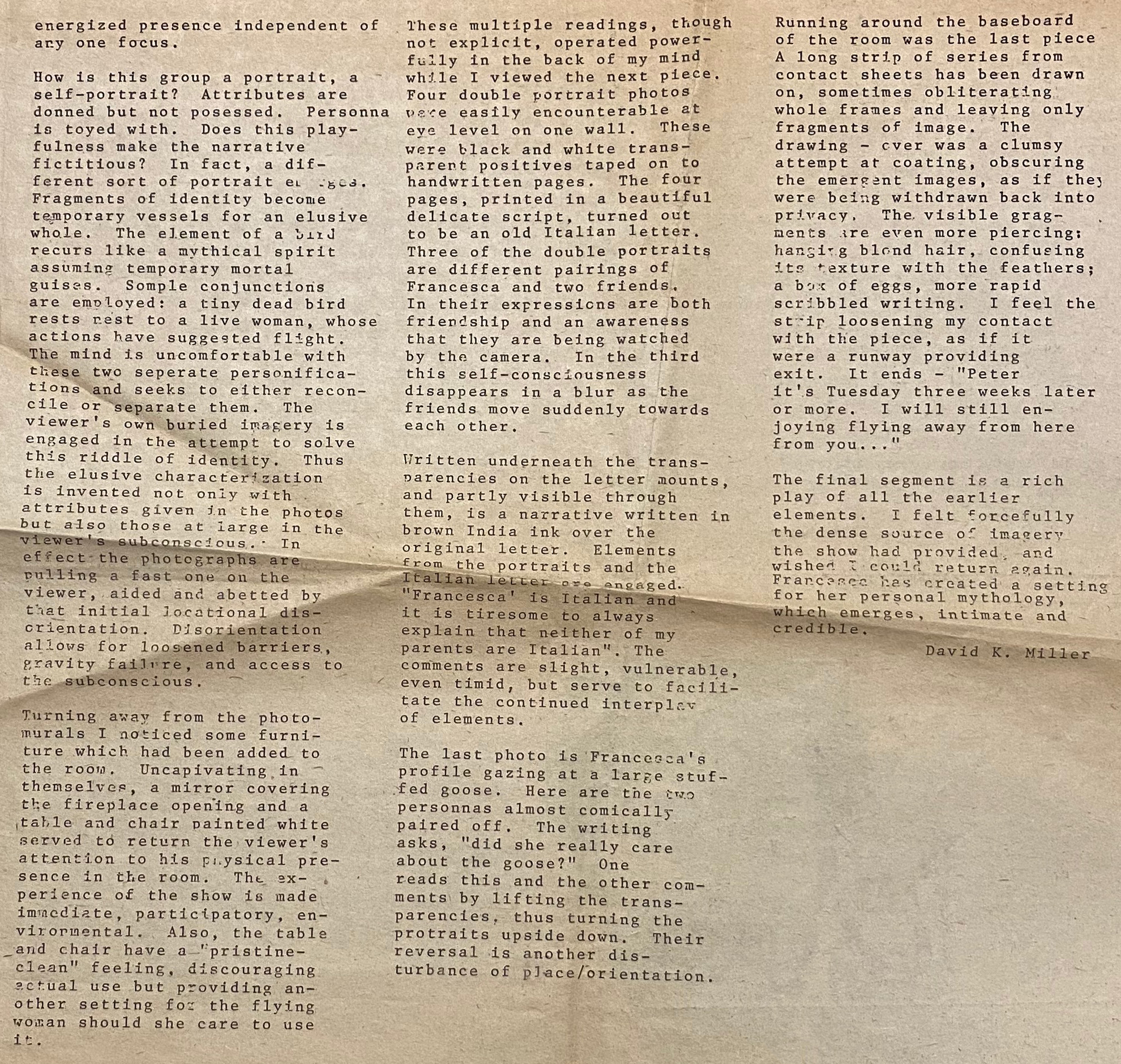 "Though it was billed simply as photography, Francesca Woodman's show was liberally manipulated, sculpted and narrated…individual photographs contributed to an unfolding composition the way dream shapes and phrases precipitate a setting or presence,” a review in the student newspaper began. The exhibition included small photographs surrounding the perimeter of the room and a series of large-scale prints hung high and low on the wall. Francesca positioned herself in elaborate tableaux with stuffed birds, torn paper, and other props and photographed herself from above through a hole in the floor. The review continued: