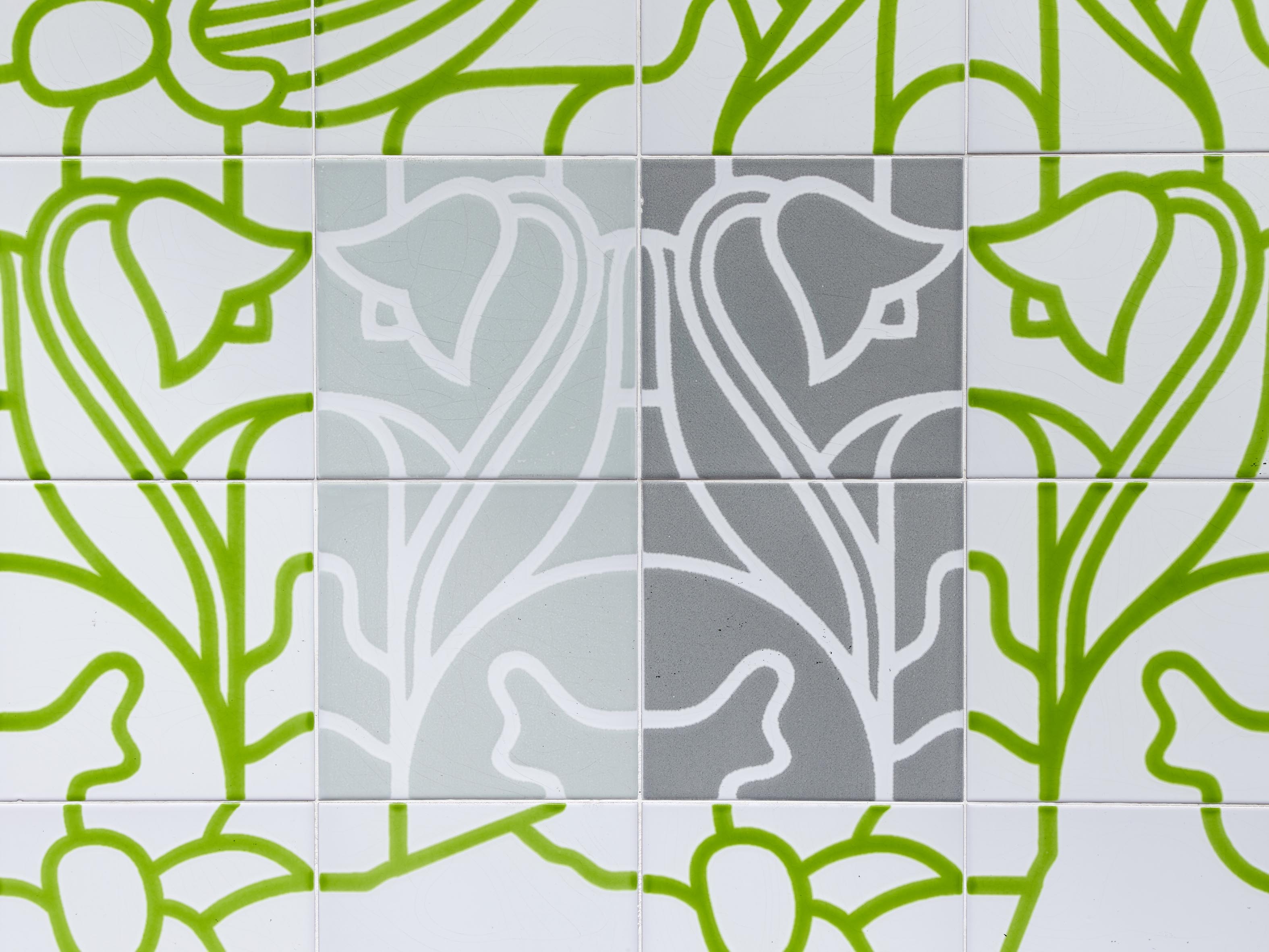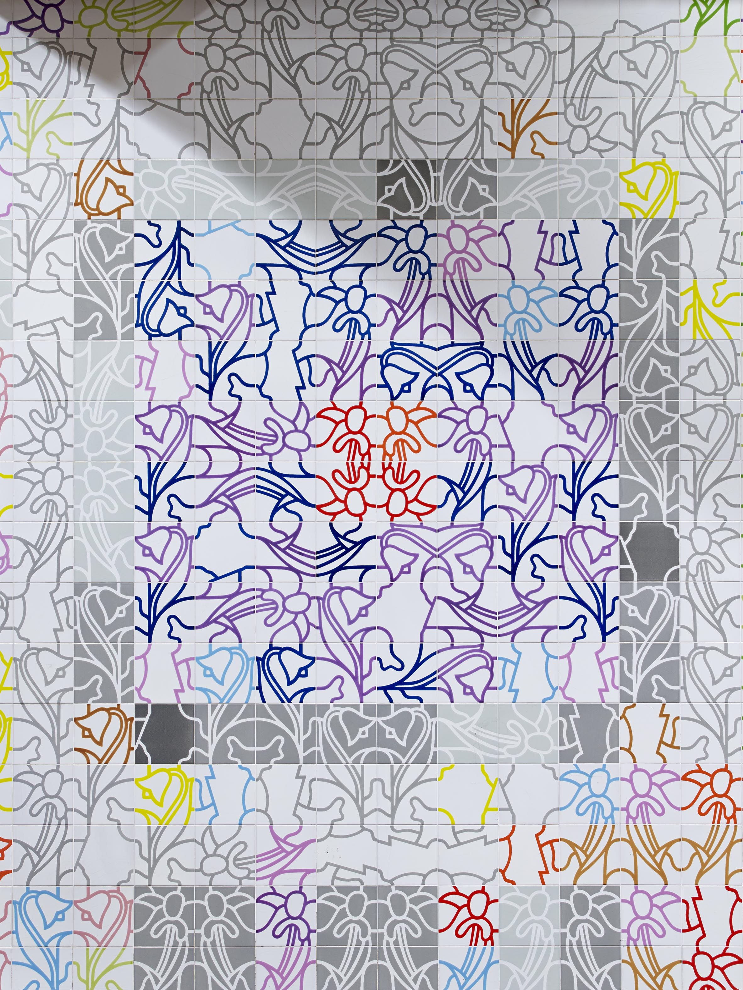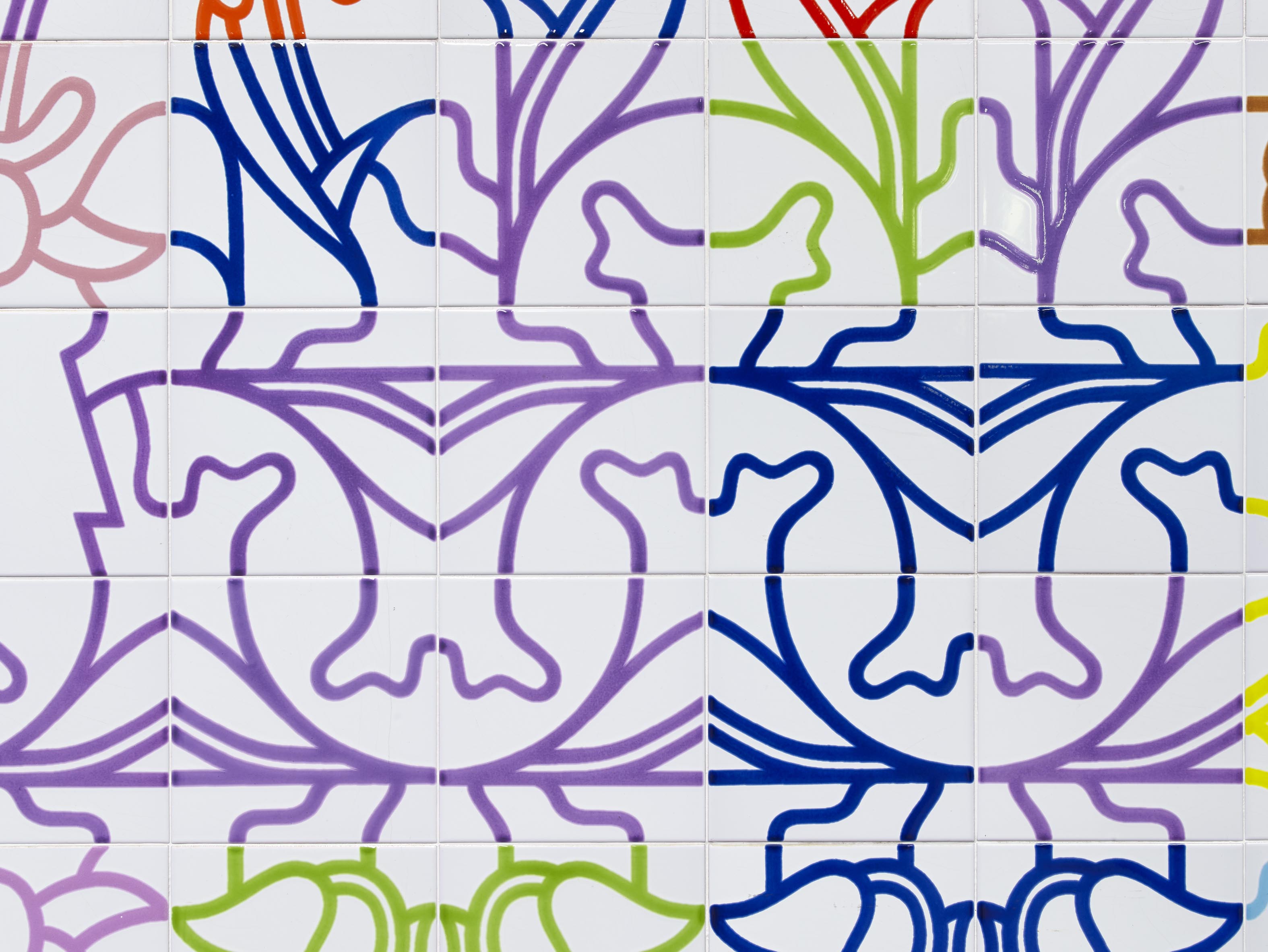 In 1984, George Woodman’s first public commission in ceramic tile was installed in the Delavan-Canisius NFTA-Metro station in Buffalo, New York. Three walls in the station’s mezzanine—measuring 11 feet high by 72 feet long in total—are still today covered in pattern made from 8 inch square tiles, greeting riders as they pass from the trains to the street. “The mural is based upon a modular system,” Woodman wrote, using "six basic elements and their six reversed, or mirror, images. These can be combined in a great many ways. The modules have been executed in twelve colors of line on a white ground and in white lines on three tones of gray. In all then, there are 180 different units used.” His intention was to “make a wall that could be viewed as a series of loosely related episodes which could be enjoyed by the casual passerby. The mural is rich in greatly varied detail which derives from the nearly infinite possibilities of combination among the several modules. An effort has been made to avoid any big, static, over-all composition which would need to be seen or ‘taken in' from a single view.”