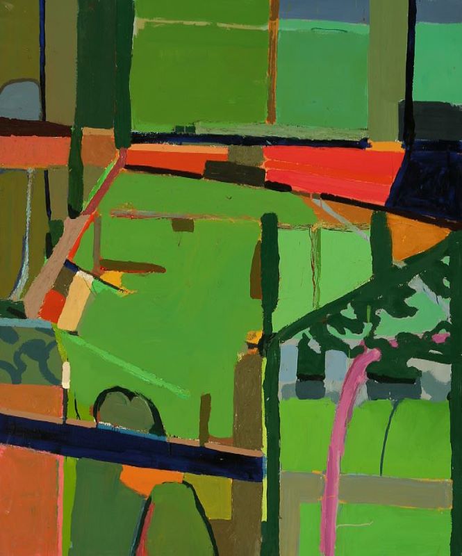 George Woodman’s paintings of the early 1960s built upon a dialogue with modernists from Cézanne (an early and important influence) to Diebenkorn. The color green was prevalent, even as his technique evolved from expressionist representations to abstracted views of the landscape which were more topographic, resembling maps.