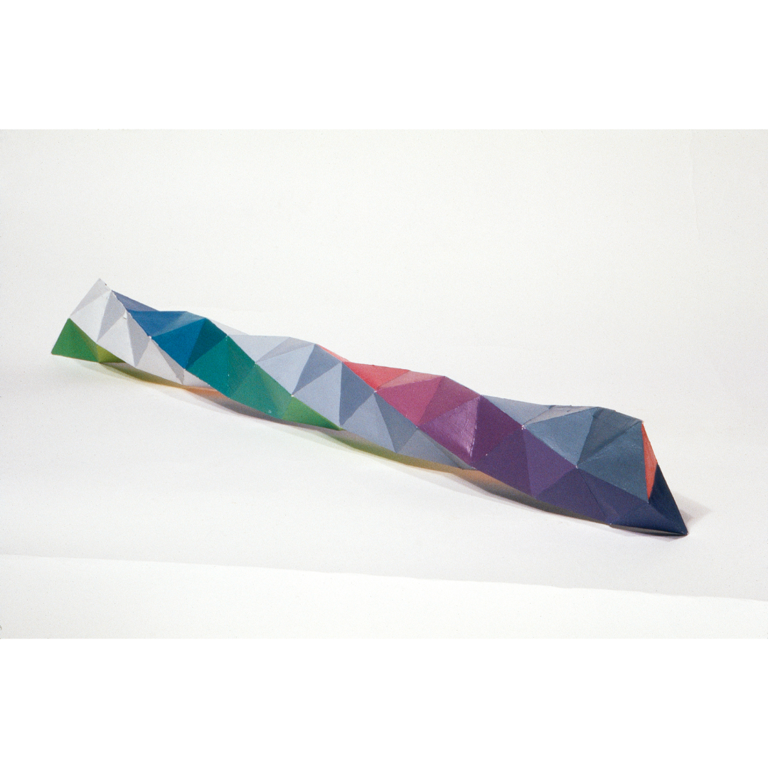 Like the [earlier] pyramidal painting [hung in his yard in 1964], these works can be seen as a bridge between Woodman’s two-dimensional paintings and his [later] architecturally inspired installations…They reveal an artist deeply engaged with the possibilities of form and space, experimenting with the ways in which patterns are able to both occupy and transform physical environments… A comparison of these polyhedral sculptures with Untitled (1975) reveals the degree to which Woodman was using pattern and color to think in three dimensions.”