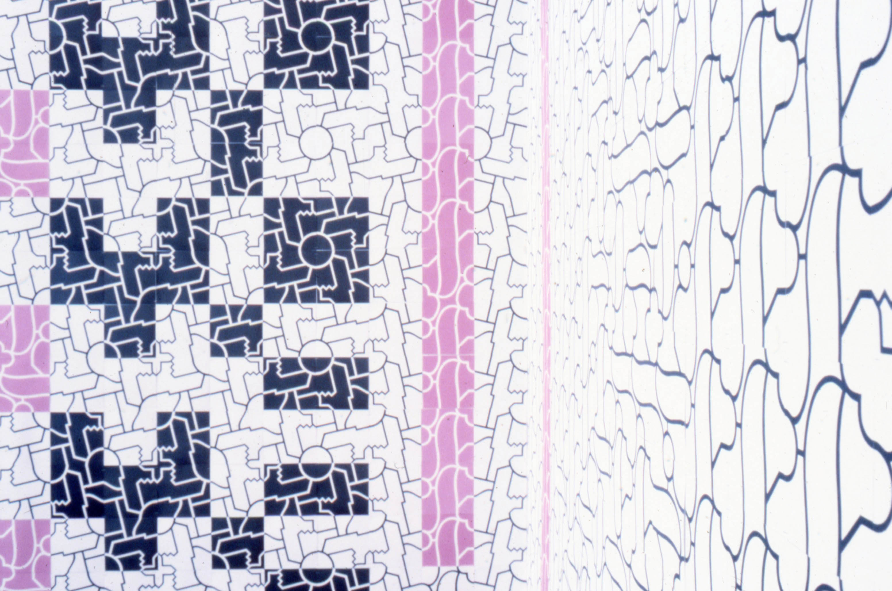 Here is one such group, printed in magenta, black and white from George’s original drawings. He used these paper tiles to create large-scale, ephemeral installations in varying iterations at the Denver Art Museum (1980) and Hadler-Rodriguez Gallery (1981), among numerous other locations which we are piecing together. Turning simple shapes into modular forms that could be rotated and rearranged in a seemingly endless combination of compositions animated George’s work with what he referred to as “non-periodic pattern.”