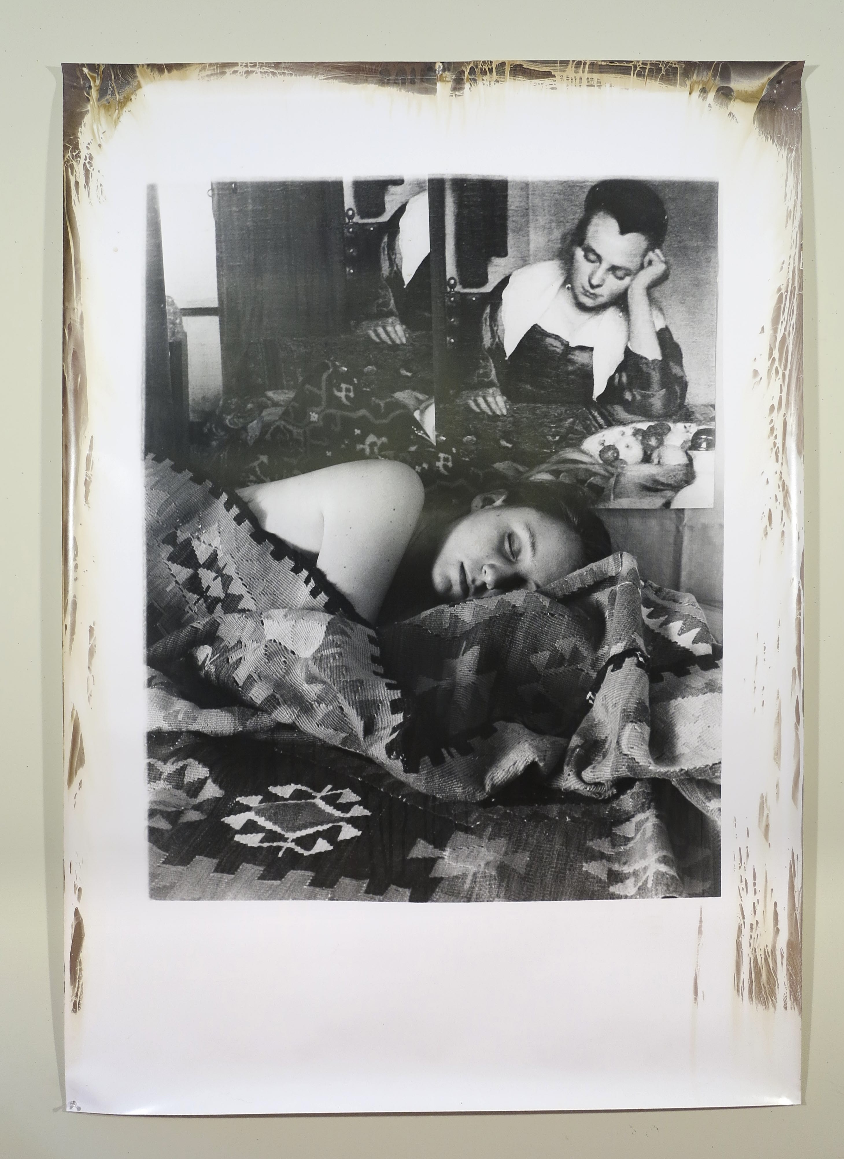 L to R: “Three Views of Eleonora,” 2011. 18 x 24 in / “A Geometric Investigation II,” 2009. 24 x 20 in / “Variation on Vermeer,” 2010. 24 x 20 in / “Vermeer and Sleeping Eleonora,” 2010. 59 x 41 1/2 in / George Woodman with Eleonora Picheca, 2011. Courtesy Eleonora Picheca. All gelatin silver prints. All works by George Woodman © Woodman Family Foundation / Artists Rights Society (ARS), New York