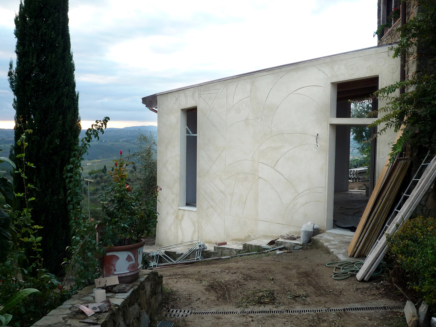 In 2008, the Woodmans renovated and expanded upon a storage space underneath their centuries-old farmhouse in Antella, Italy, transforming it into George’s new studio. His darkroom was tucked into the old stone structure, which had once been a wine cellar. They created a big, bright room with plenty of space for photography, painting, writing, and thinking, surrounded by views of the Tuscan countryside out the windows. Never one to leave a canvas blank, George decorated the new exterior wall with his version of “sgraffito,” a technique of scratching into plaster walls, popularized in 15th and 16th Century Italy and significant in the Italian Renaissance.