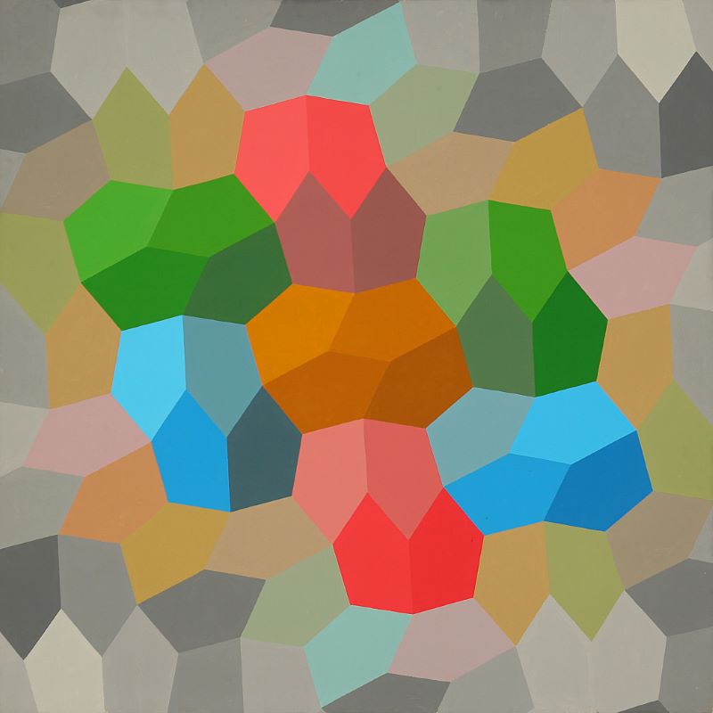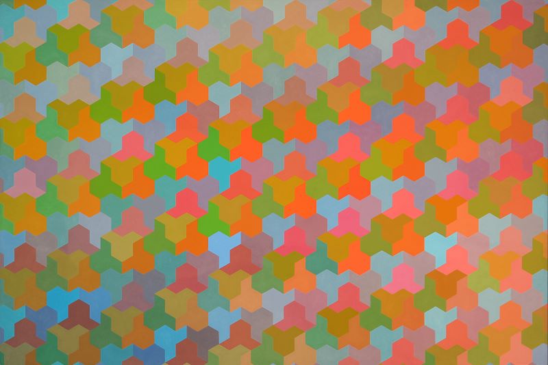 Tessellations are a type of pattern in which one or more geometric shapes are repeated—and often rotated and reflected—to seamlessly cover a surface. In George Woodman’s case, that surface was a canvas. His work with this mathematical patterning system, which began in his Tuscan studio after seeing the famed Islamic patterned tiles at the Alhambra, distinguished his paintings and eventually evolved into two decades-worth of visual inquiry. This did not go unrecognized. In 1967, Woodman was awarded a fellowship from the National Endowment for the Arts. Pattern on Trapezoid—currently on view at DC Moore—was included in the catalogue and exhibition for fellowship recipients from the Southeast and Southwest at the Witte Museum in San Antonio. He then used his $5,000 in award money to purchase a farmhouse in Antella, Italy, just outside of Florence. There he set up a studio, allowing him to live and work in Italy for part of each year for the rest of his life, deeply influenced by the cultures of Europe and beyond.