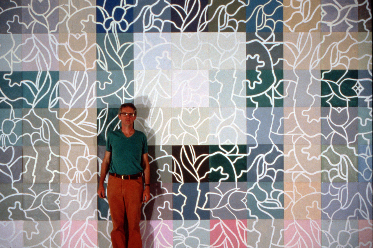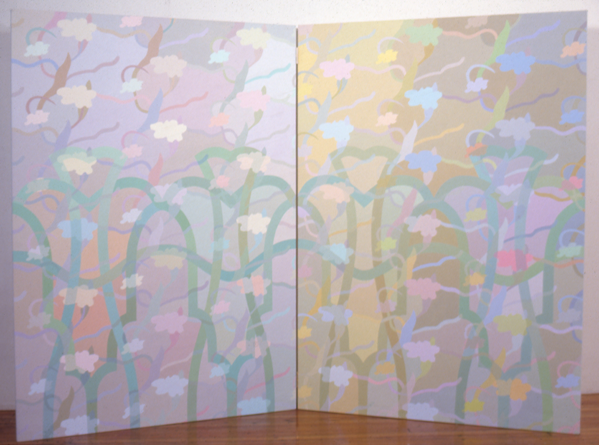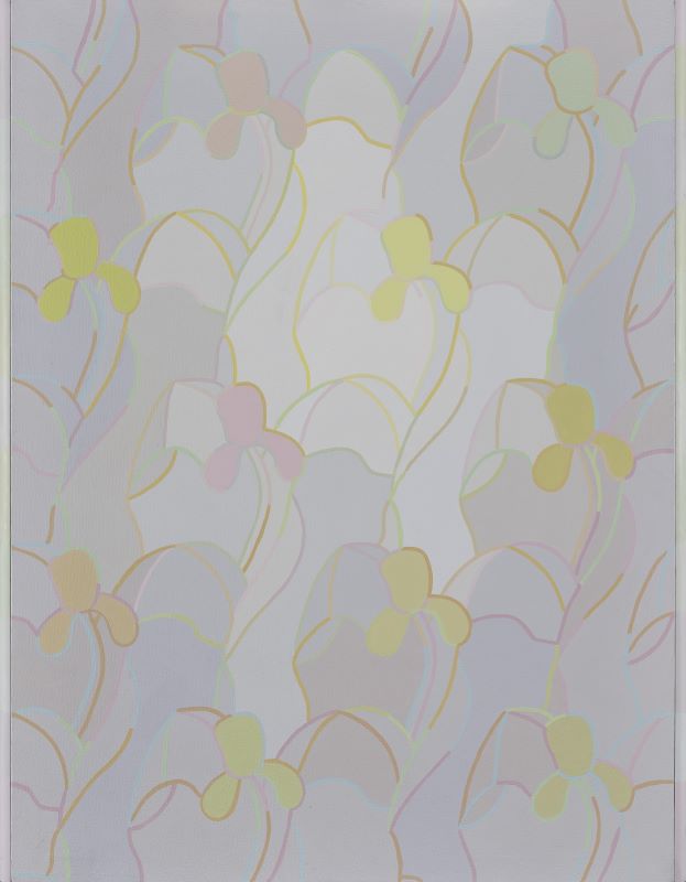 In her essay for Arts Magazine related to George Woodman’s 1982 solo exhibition at Haber-Theodore Gallery in New York, Irene Clurman discusses the transformation of Woodman’s patterns and palette into more representational forms.“Idiosyncrasies in the patterns thwart attempts to comprehend fully the logic behind interlacing of tulips, irises, and lattice designs. Some configurations appear only once, as accents; others recur as mirror images; still others are caught in the act of changing colors as forms overlap. Only the artist knows for sure what will happen next.