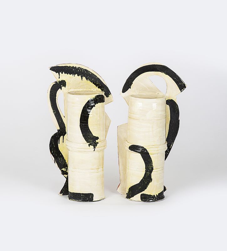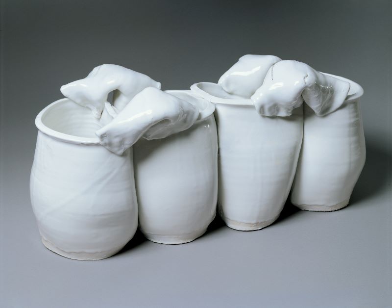 L to R: George Woodman. “285” or “Bari” or “Winterreise”, 1975, 65 x 65 in. Acrylic on canvas | Francesca Woodman. “Untitled”, c. 1975-78, 6 5/8 x 6 9/16 in. Gelatin silver print | Betty Woodman. “Joined Vases”, 1972, 11 1/2 x 23 x 10 in. Porcelain | Francesca Woodman. “Untitled”, c. 1979-80, 11 x 14 in. Gelatin silver print | George Woodman. “Study in White: Marble from Michelangelo’s Quarry”, 2004, 16 x 20 in. Gelatin silver print | Betty Woodman. “Boys”, 2013, 28 x 28 x 7 in. Glazed earthenware | George Woodman. “Untitled”, 1974, 84 x 84 in. Acrylic on canvas | Detail from Betty Woodman. “Aeolian Pyramid”, 2001/2006, approx. 150 x 168 x 100 in. Glazed earthenware, epoxy resin, lacquer, paint | George Woodman. “Tessellation Sky”, 1975, 54 1/2 x 54 1/2 in. Acrylic on canvas | Betty Woodman. “Nina’s Room”, 2012, 86 x 107 x 12 1/2 in. Glazed earthenware, epoxy resin, lacquer, acrylic paint, canvas | Francesca Woodman. “Untitled”, c. 1977-78, 3 13/16 x 3 7/8 in. Gelatin silver print | Betty Woodman. “Judith’s Window”, 2012, 59 1/2 x 43 1/2 x 10 1/2 in. Glazed earthenware, epoxy resin, lacquer, acrylic paint, canvas, wood | Francesca Woodman. “Untitled”, 1980, 8 1/2 x 8 1/2 in. Gelatin silver print | Betty Woodman. “Divided Vases: Window”, 2012, 33 1/4 x 42 x 7 1/2 in. Glazed earthenware, epoxy resin, lacquer, paint | Francesca Woodman. “Untitled”, 1976, 5 1/8 x 5 1/8 in. Gelatin silver print | George Woodman. “Untitled”, c. 1980, dimensions unknown. Acrylic on canvas | Francesca Woodman. “Untitled”, c. 1979-80, 3 7/8 x 5 5/8 in. Gelatin silver print | Francesca Woodman. “Untitled,” c. 1979-80, 5 1/2 x 5 5/8 in. Gelatin silver print | George Woodman. “Christening Dress and Roman Sculpture (A Roman Fragment with a Christening Dress)”, 2011, 42 x 38 1/2 in. Oil on gelatin silver print | Betty Woodman. “White Amphoras”, 2004, 33 x 57 x 12 in. Glazed earthenware. All artworks © Woodman Family Foundation / Artists Rights Society (ARS), New York