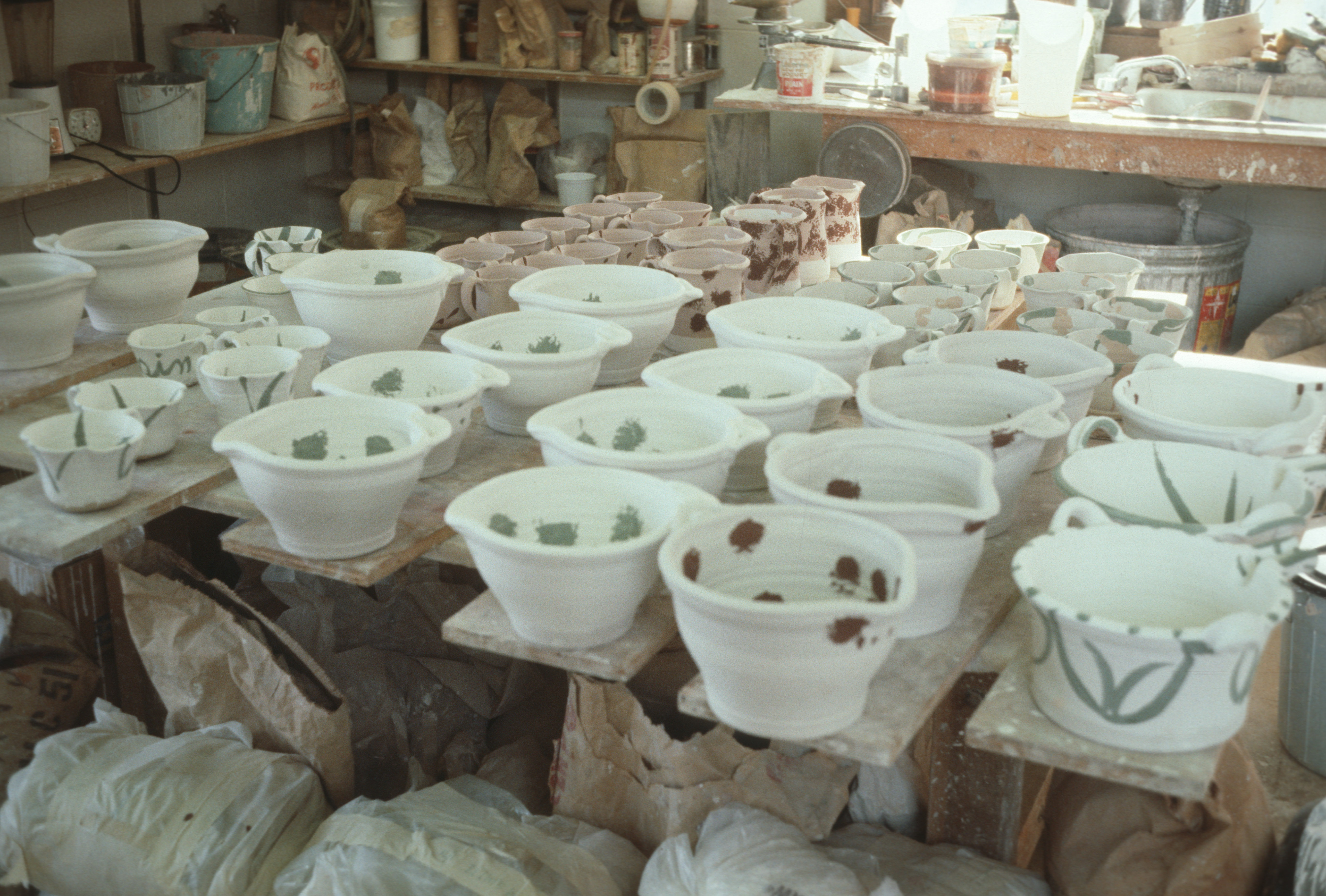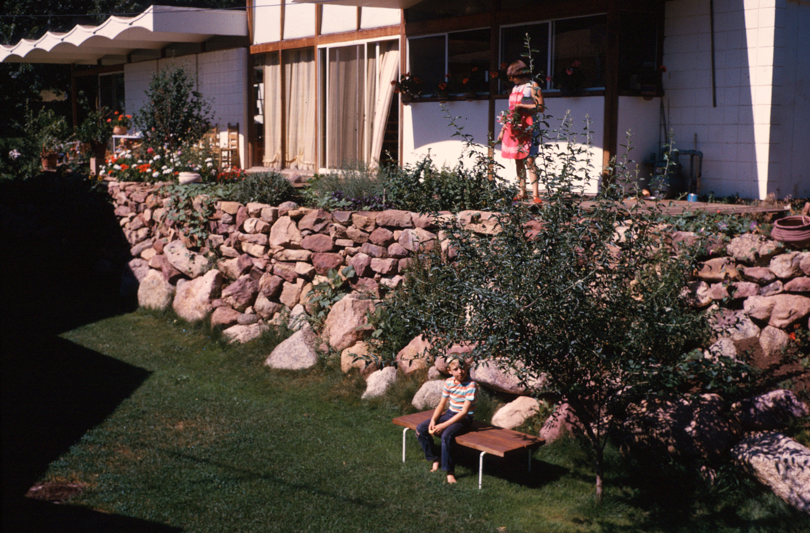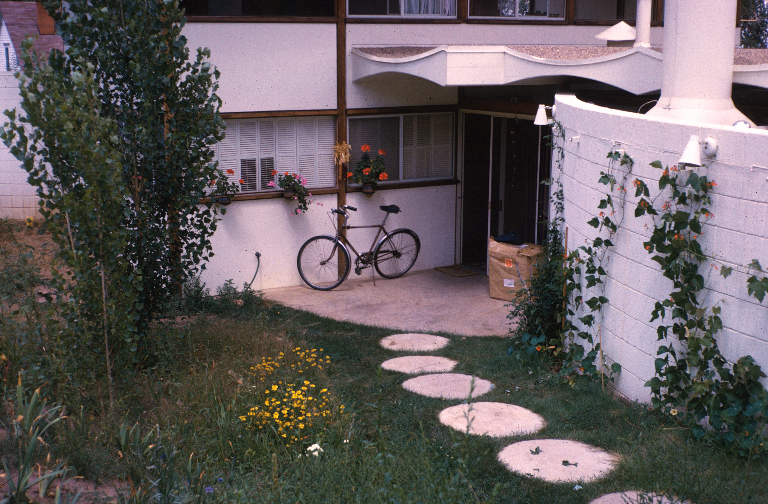 The house was set in the foothills of the Rocky Mountains, close to the University of Colorado, where George was a Professor of Painting and Philosophy of Art and would ride his bicycle daily to teach. The floor-to-ceiling plate glass windows filled the house with light and provided a perfect view of the mountains and the deer that visited regularly to eat from the apple tree in the yard. The house was designed with curving landscape walls which connected its interior with outdoor living spaces, including a patio with a marble table—the site of many of Charlie and Francesca’s birthday parties and numerous other gatherings and meals. Betty’s studio and kiln were set in a round building added behind the house; twice a year, the whole yard was filled with her pottery for “studio sales,” significant events in the Woodman household, and memorable, too, in the city of Boulder.