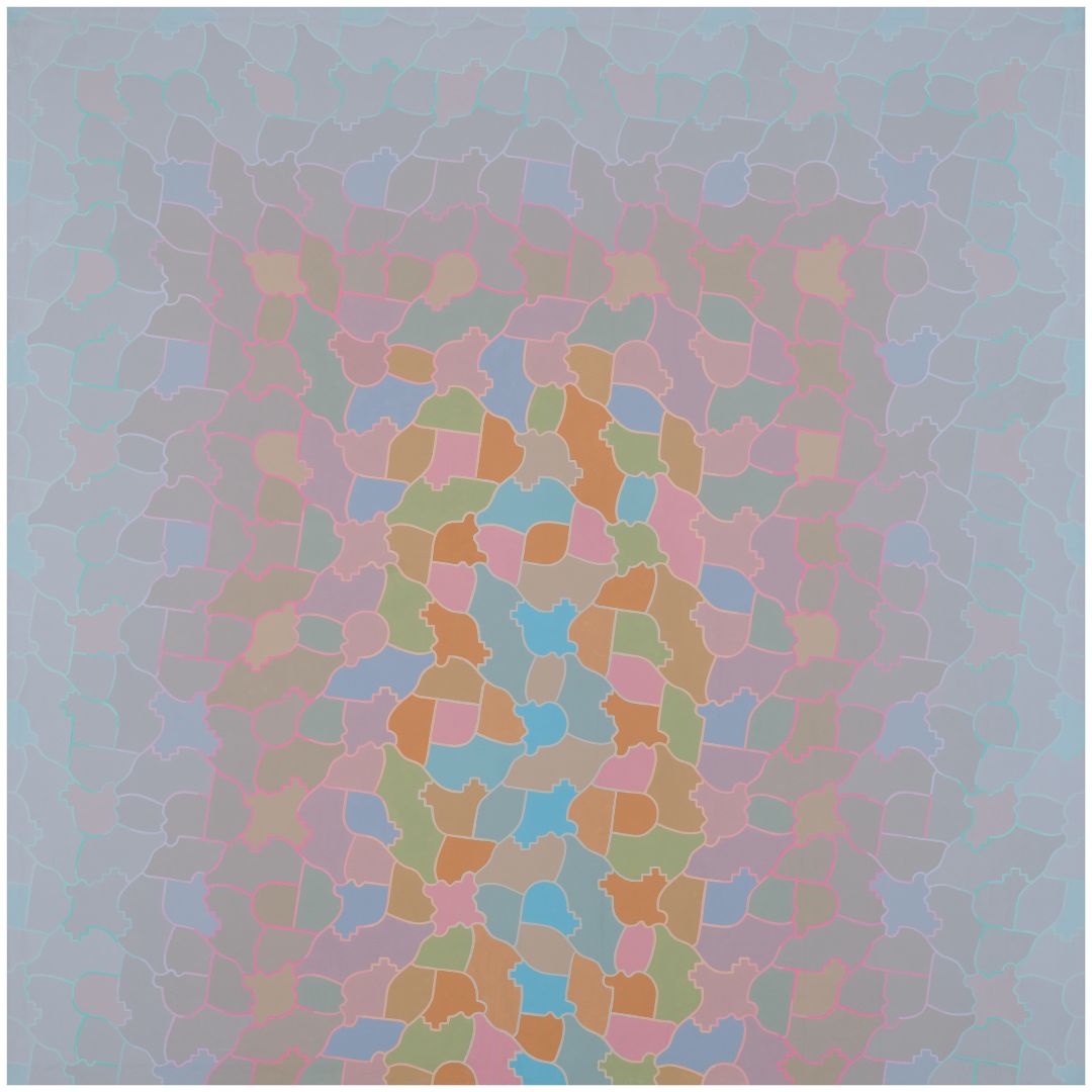 By 1977, George Woodman’s tessellation paintings became non-periodic or aperiodic, consisting of a set of shapes which tiled the canvas but did not necessarily repeat. In her catalogue essay, Rebecca Lowery elaborates on one example: “Woodman’s tessellating forms in Grey Portal are intriguingly eccentric, their mix of straight and irregularly undulating facets resembling something like a map. The complexity of the arrangement is astounding: more than 50 different tile shapes make up its mysteriously undulating surface, some of which are only seen once or twice.