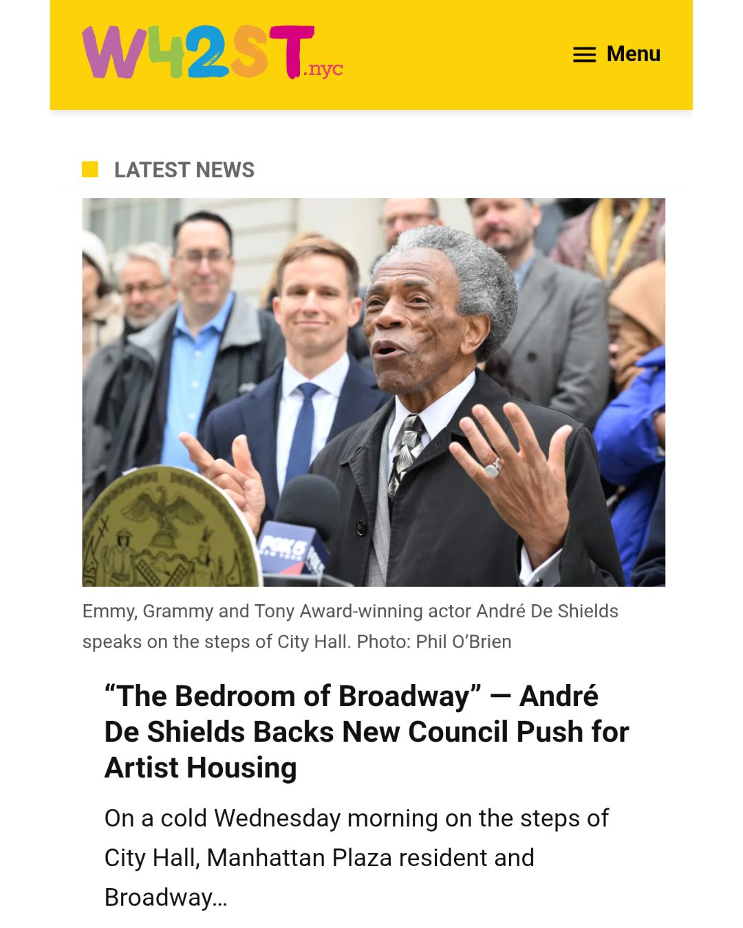 WFF was pleased to attend a press conference at City Hall hosted by City Council Members Keith Powers and Erik Bottcher to announce their proposed new legislation that will lower the barriers to create affordable housing for artists in New York City. Folks from Actors’ Equity, Broadway Cares, Schubert Organization, National Black Theatre, Entertainment Community Fund, New York Foundation for the Arts, and unions representing set and wardrobe designers, dancers, musicians, and more joined them behind the podium to speak up in support of this legislation, which recognizes the need for greater investment in those who make this city a thriving cultural capital. “What is New York City without artists?” Council Member Bottcher asked the crowd.