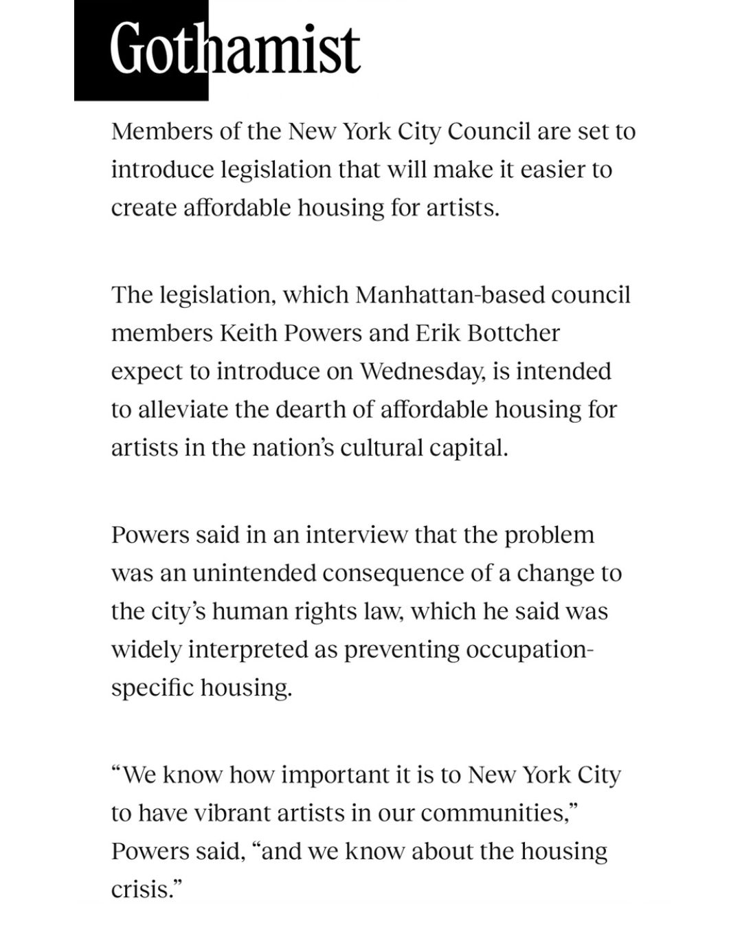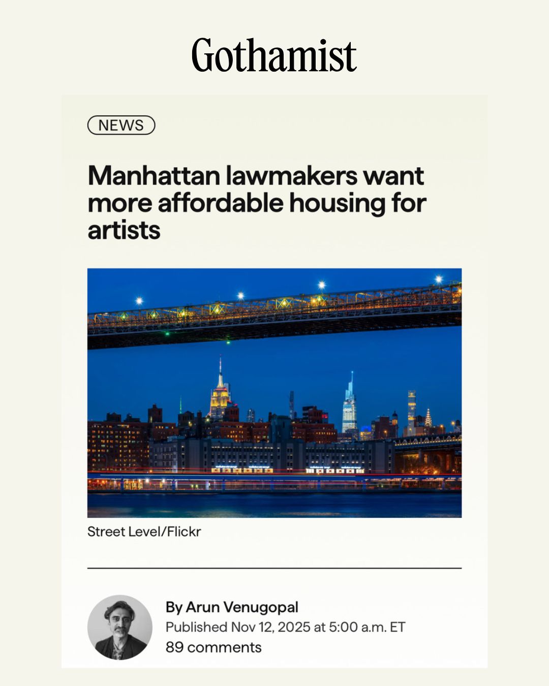 Speakers, including Broadway legend André De Shields, shared moving stories about the creative careers and communities they were able to build thanks to stable and affordable housing, while younger artists described the struggles they face today just trying to pay rent that far outpaces their wages. NYFA’s Board Chair, Sarah Young O’Donnell, spoke about our partnership on the WFF HSG (and gave a shout-out to Betty, Francesca, and George!) explaining that “we’ve learned how very great the need is for affordable housing for artists in New York City.” Here at WFF, we’re grateful to be contributing to this important effort alongside so many passionate and principled advocates for artists!