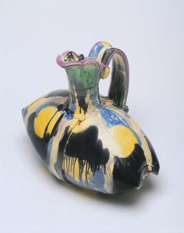 Betty Woodman began her career as a potter, inspired by a Bauhaus ethos to make beautiful objects for people to use in their daily lives. By 1980, when she and her husband George Woodman—a painter and photographer—purchased the New York City loft where they lived and worked for part of each year until the end of their lives, she had already begun moving away from the purely functional concerns of ceramics. Woodman began collaborating with artists connected to the Pattern and Decoration Movement, experimenting with other media through the Fabric Workshop and Museum, and creating ambitious installations in clay. In 1983, she began showing with Max Protetch Gallery, where she joined a number of artists similarly concerned with the edges of a craft / art discourse. Soon after, she left functional pottery behind for good, and instead her concerns became conceptual and sculptural. She began to make vases about vases, as subject rather than object References to function were exaggerated and almost absurd. Woodman’s “pillow pitchers” were too unwieldy to reasonably use, her soup tureens would have been difficult for serving, her napkin holders demanded pedestals rather than tabletops. Her use of color and gestures as a painter became more sophisticated. She began assembling groups of vessels and clay fragments into compositions. Ceramic slabs became a surface. By the end of the decade, Woodman was comfortably working on the wall—a painters’ space. All of this culminated in her definitive and career-changing shift in the 1990s.