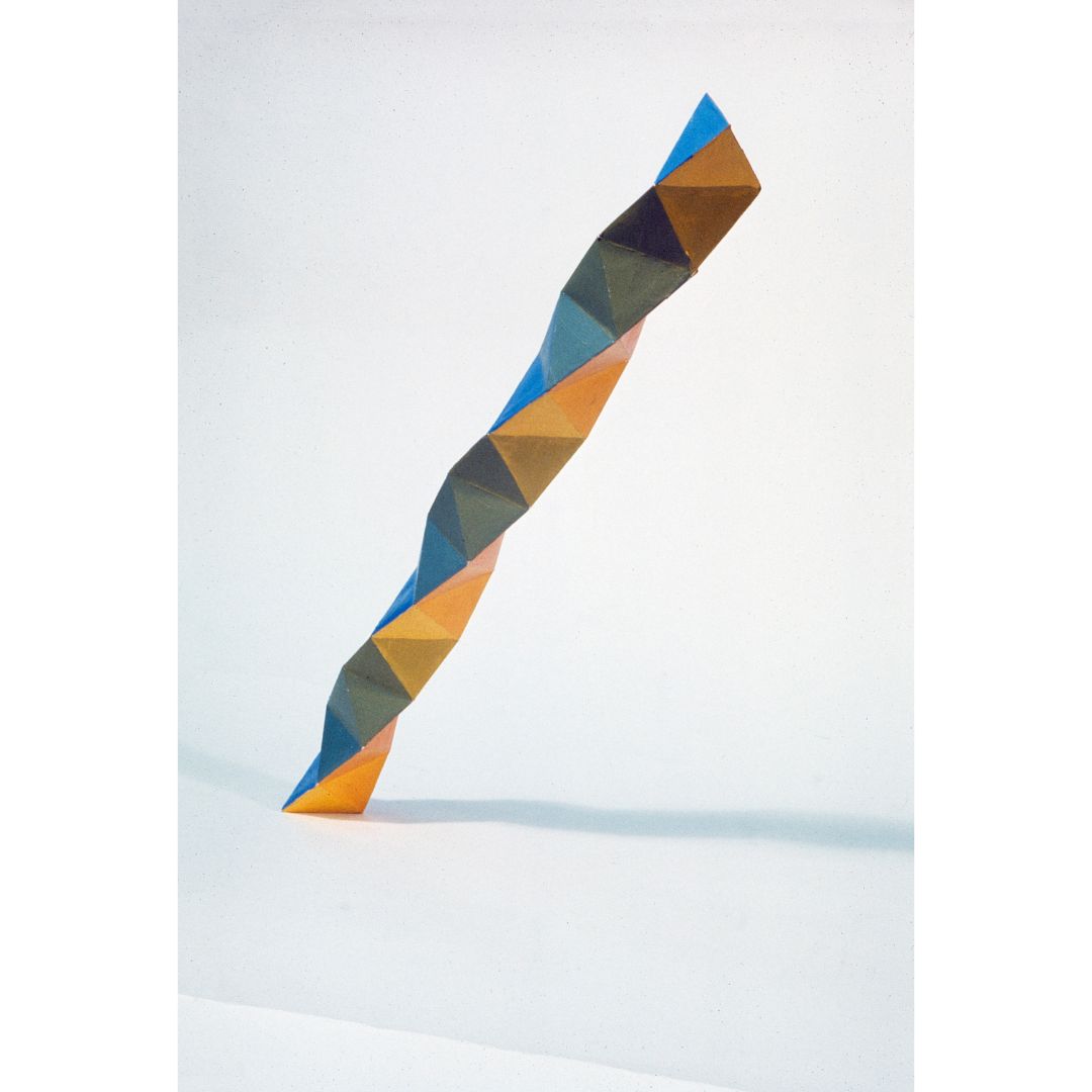 But Woodman’s exploration of geometry as a spatial discipline was not limited to the surface of a canvas; it also included a series of sculptures. “These sculptures,” Lowery continues, “which he likely made in the mid-1970s, brought his abstract forms to life, transforming patterns into dynamic spatial entities… he photographed them extensively, arranging individual works in differing configurations that revealed the variety of their faces and vertices.“