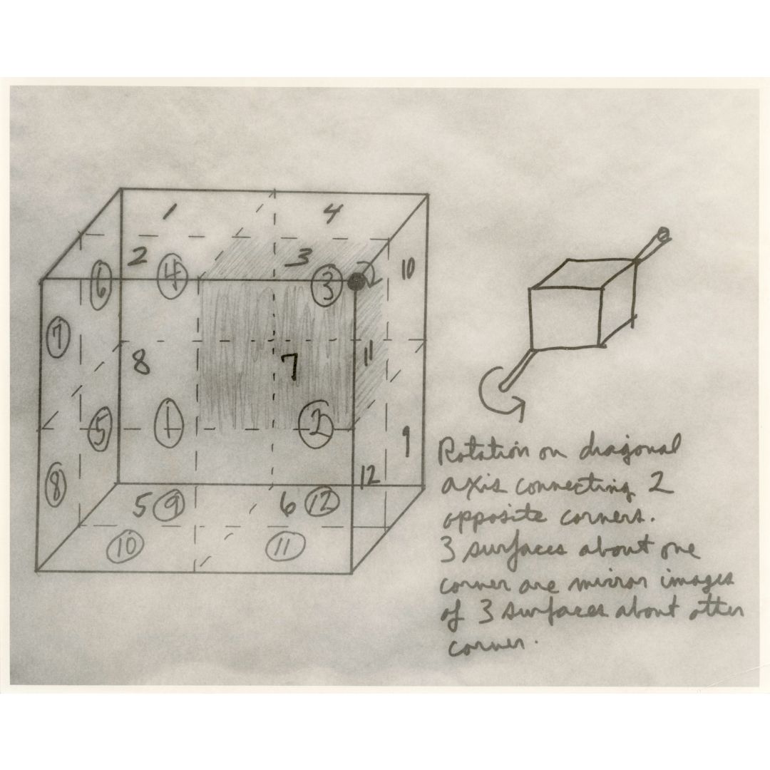 George Woodman’s tessellated pattern paintings built upon observations made in the three-dimensional realm of architecture, specifically in the tiled surfaces that covered walls and floors as they emerged from and receded into space. By understanding the geometric particulars in three-dimensions, Woodman could construct an illusion of space within a two-dimensional pattern painting. As Rebecca Lowery explains in her catalogue essay, he seems to have figured this out through a set of sketches of the rotations and reflections of numbered dice. “In a sense,” she writes of these sketches,” Woodman is working out what it looks like for flat shapes to tumble through dimensional space.”