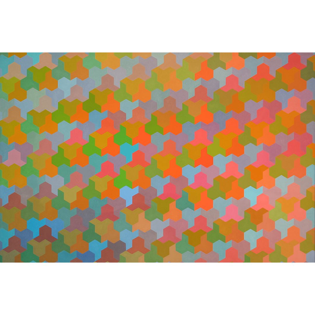 Tessellations are a type of pattern in which one or more geometric shapes are repeated—and often rotated and reflected—to seamlessly cover a surface. In George Woodman’s case, that surface was a canvas. His work with this mathematical patterning system, which began in his Tuscan studio after seeing the famed Islamic patterned tiles at the Alhambra, distinguished his paintings and eventually evolved into two decades-worth of visual inquiry. This did not go unrecognized. In 1967, Woodman was awarded a fellowship from the National Endowment for the Arts. Pattern on Trapezoid—currently on view at DC Moore—was included in the catalogue and exhibition for fellowship recipients from the Southeast and Southwest at the Witte Museum in San Antonio. He then used his $5,000 in award money to purchase a farmhouse in Antella, Italy, just outside of Florence. There he set up a studio, allowing him to live and work in Italy for part of each year for the rest of his life, deeply influenced by the cultures of Europe and beyond.