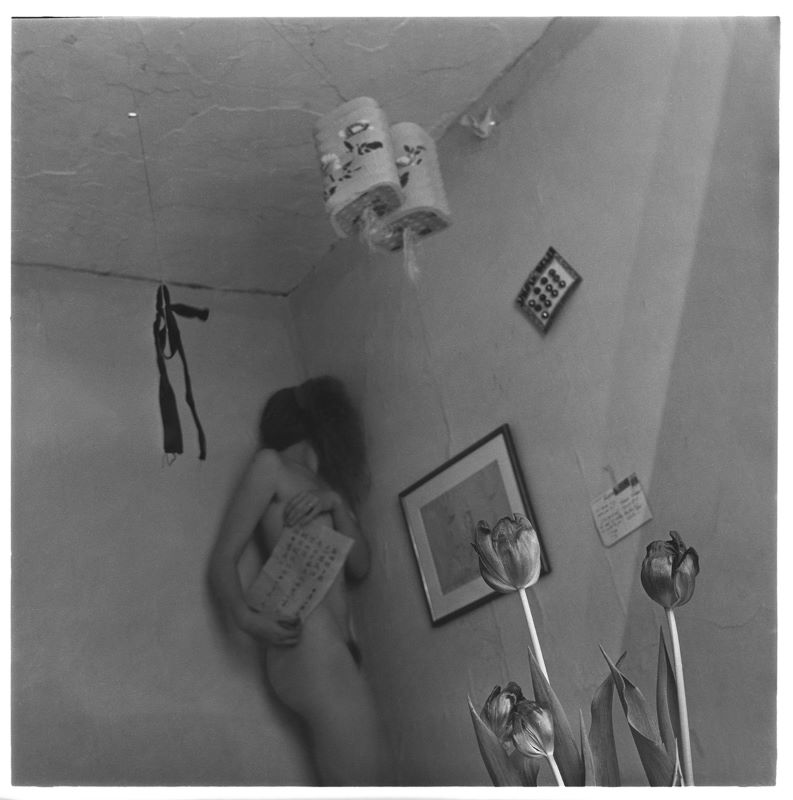 “Sitting in bed – the slide projector is humming in the other room – a slide of helen as caryatid – im feeling very very lazy and contented – the cat lounges on a newly washed pile of pink clothes and the room is strewn with fresh tulips – even my fish has fresh flowers from Chinatown.”