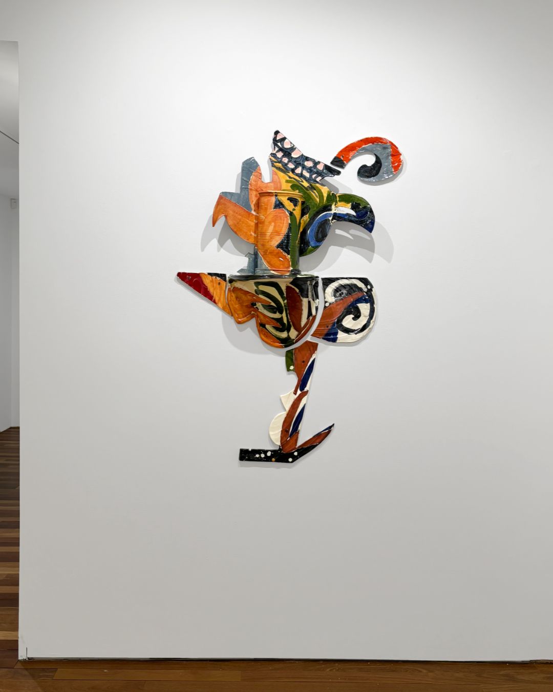 Betty Woodman’s Balustrade Relief Vase: 30 (1991) is shown alongside works by Beverly Semmes, Kennedy Yanko, Suchitra Mattai, and others. Adamson, who calls Woodman “the leading ceramic artist of her generation,” writes: “Though her materials were those of the studio potter she’d once been—nothing more than clay and glaze—she conjured from them unprecedentedly energetic forms, greatly inspired by the interwoven histories of dress and painting, particularly those of Italy, where she spent much of her time. Her Balustrade Relief Vase: 30, a Matisse-inflected still life, is a wonderful example. It takes a loose, caroming journey down the wall, not depicting fabric in any literal sense, but enjoying a comparable freedom of movement.”