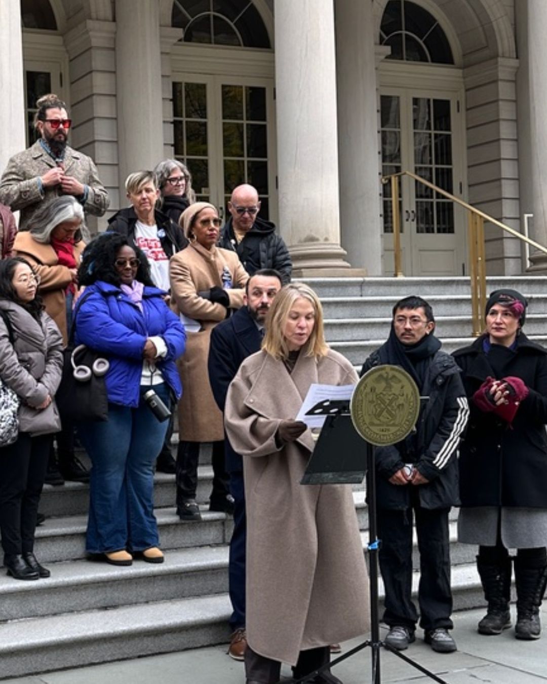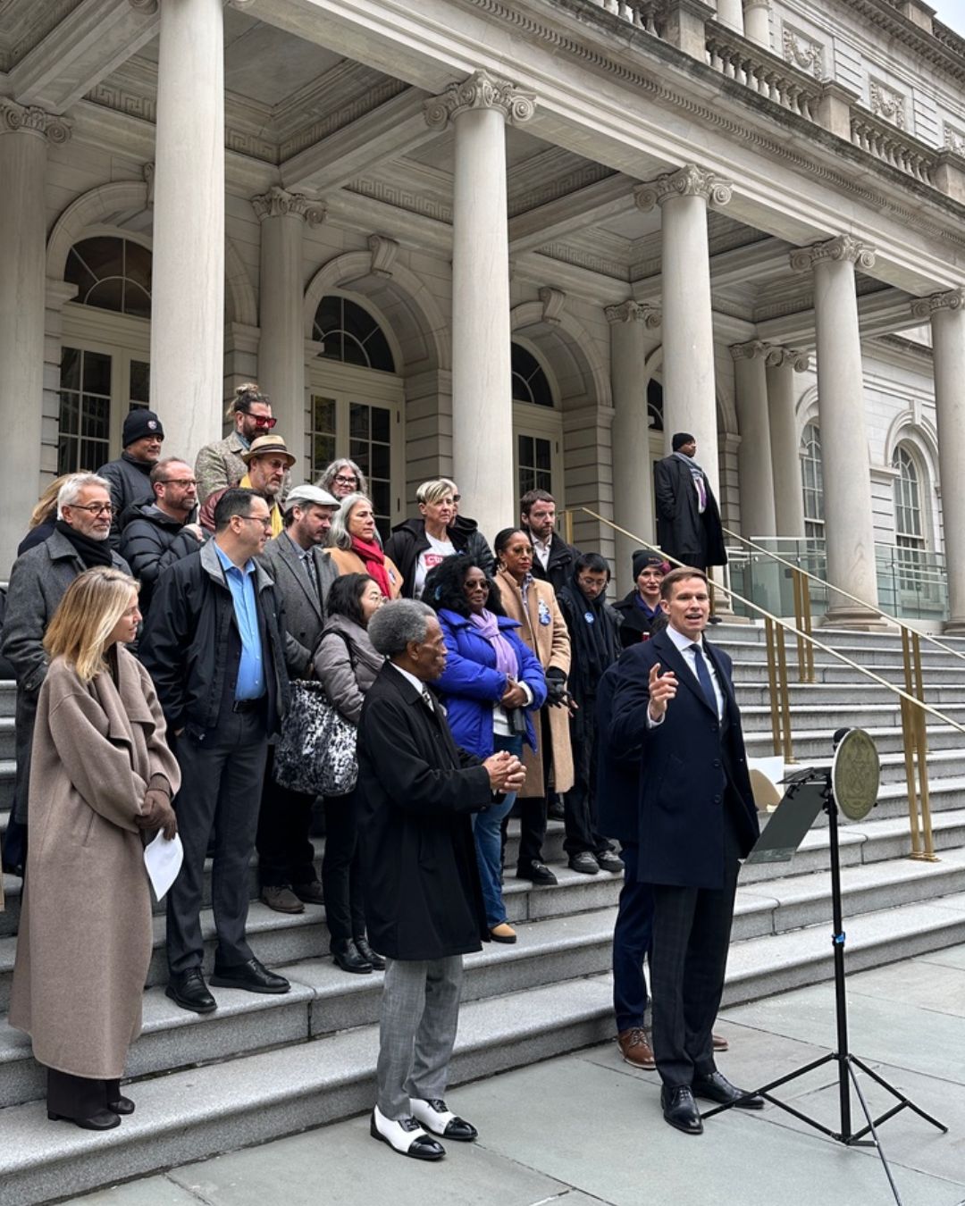WFF was pleased to attend a press conference at City Hall hosted by City Council Members Keith Powers and Erik Bottcher to announce their proposed new legislation that will lower the barriers to create affordable housing for artists in New York City. Folks from Actors’ Equity, Broadway Cares, Schubert Organization, National Black Theatre, Entertainment Community Fund, New York Foundation for the Arts, and unions representing set and wardrobe designers, dancers, musicians, and more joined them behind the podium to speak up in support of this legislation, which recognizes the need for greater investment in those who make this city a thriving cultural capital. “What is New York City without artists?” Council Member Bottcher asked the crowd.