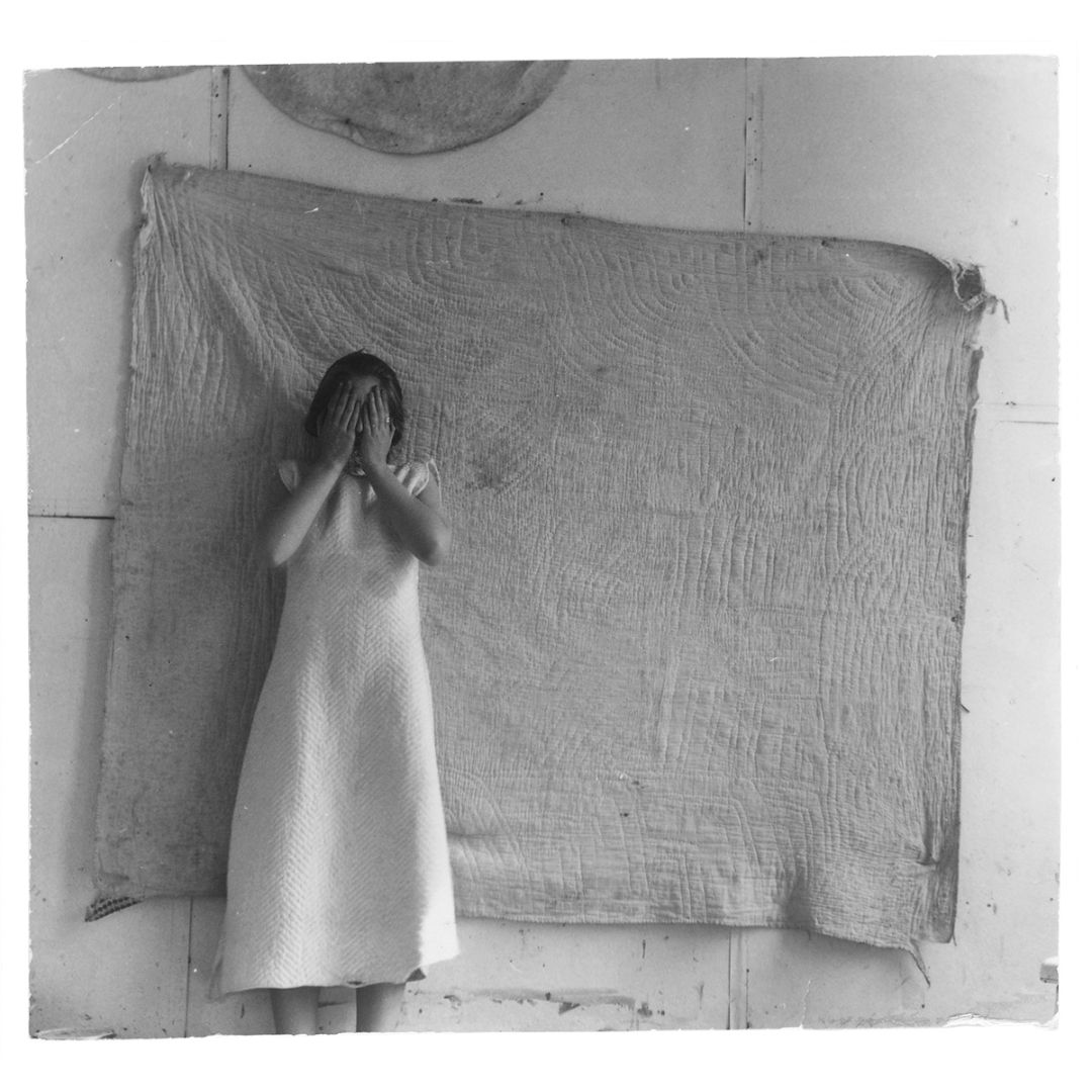 “She suspended second-hand fabric flecked with daisies to create flight—cloud-like, undulating forms that rippled across the image like the passing of time (or a message deferred by the postal network)—and captured her friends wearing cream cotton playsuits, starched stiff and embroidered with knots, pin-tucks, and lace trims: in tactile photographs repeatedly (un)-named as Untitled... Frozen within the image, her textile objects unfold a homesick haunting: as melancholic portals to the nostalgic pleasures of textiles-past.”